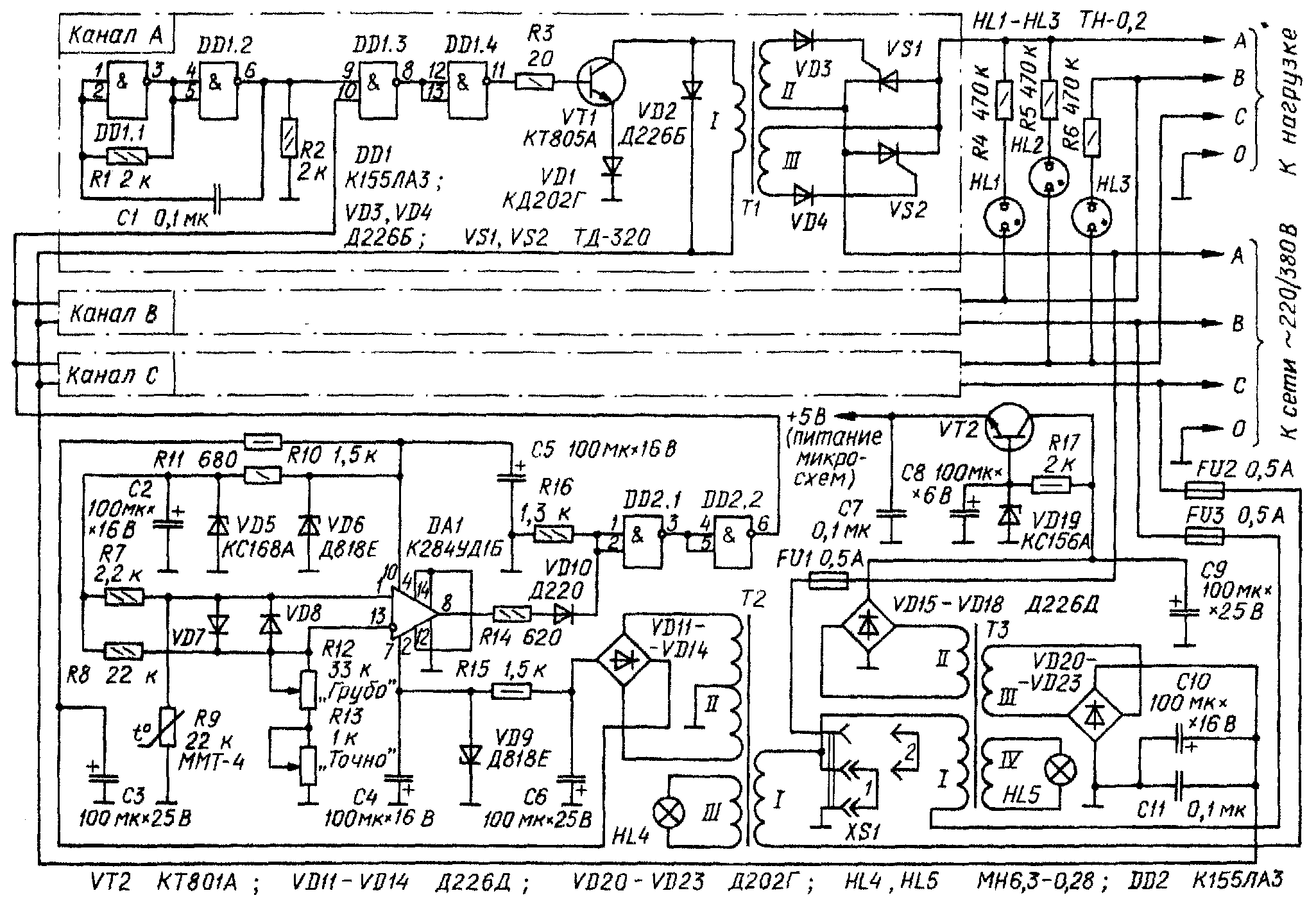 Термостабилизатор может работать и от однофазной осветительной сети. В этом случае его можно упростить, оставив только один из трех каналов. Поскольку мощность нагрузки канала не должна превышать 2 кВт, тринисторы ТД-320 целесообразно заменись на КУ202Н, уменьшив число витков вторичной обмотки трансформатора ТІ (во всех каналах) до 25.