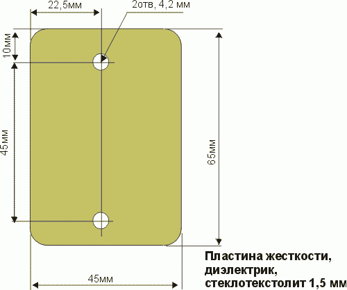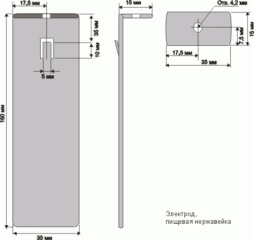 Как видно из рисунка - ничего сложного, две Г-образные платины с отверстием для крепежа и контакта. Одна пластина имеет такой своеобразный пропил - при отгибании под углом среднего выступа, он является крючком для подвешивания мешочка. На второй пластине делать такой крепежный пропил не обязательно. Следущей деталью для изготовления является пластина жесткости. Она предназначена для того, что бы во время работы устройства не произошло касания электродов каким-либо образом между собой. 220 в воде, сами понимаете вещь не приятная.