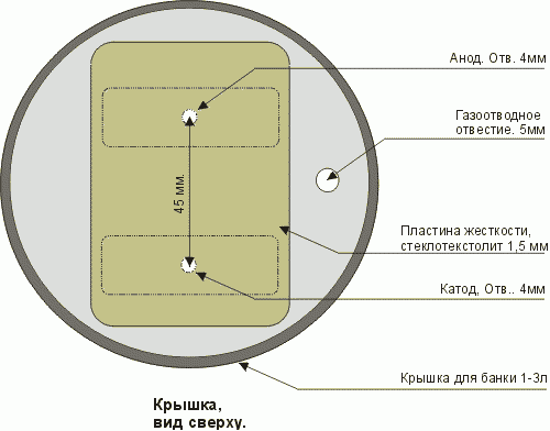 При применении в качестве несущей конструкции обычной полиэтиленовой крышки для банки эта пластинка лишней отнюдь не будет, так как при работе устр-ва наблюдается небольшой, хотя и почти неощутимый, нагрев, а как ведет себя подогретый полиэтилен Вам известно. Так что, на всякий случай не помешает. Следущей деталью является мешочек для сбора католита. Вот тут уж без женских рук точно будет тяжеловато. Материал для мешка - тонкий брезент. Для примера - мне прогодился брезент от противогазной сумки. Критерий отбора - тяжелое продувание воздуха через него. Синтетические материалы лучше не применять - какую они гадость выделят в работе угадать трудно. Когда эти компоненты будут готовы, можно приниматься за крышку. Самая обычная крышка для банки. В ней нужно проделать 3 отверстия: 2 крепежные, одно газоотводное.