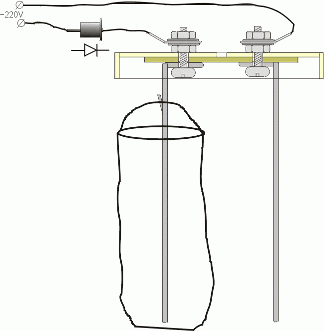 Как видите, ничего сложного. Можно отметить, что гаек на каждом болту должно быть по две. Одна для крепежа электрода, другая для обеспечения надежного контакта. Для контакта применены площадки от диодов типа КД202, зажатые между двумя шайбами. В качестве диода можно применить любые с рабочим напряжение около 400 вольт. Эдинственное условие - подключать его нужно так как показано на рисунке, иначе католит у Вас получится не в мешочке, а вокруг него, т.е. всё наоборот. Если применить диод КД202, то крепить к его резьбе можно непосредственно анодную пластину, заметьте - анодную, т.к. на корпусе у него анод. А катод тогда подключен непосредственно к 220. Правда, сам я применил вообще диодный мост. Как сами понимаете у двуполупериодного выпрямителя и производительность в два раза больше.