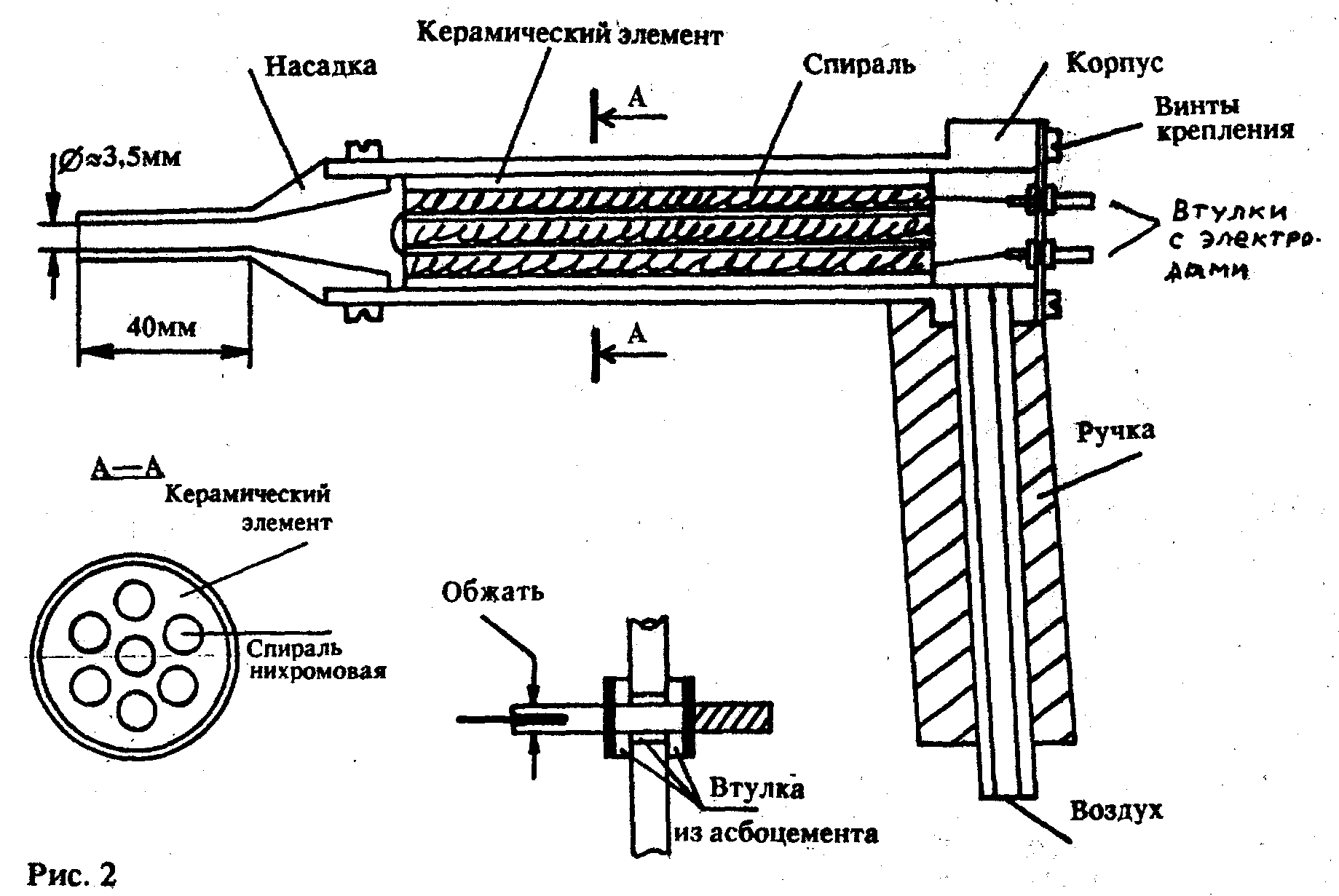 Извечная проблема для радиолюбителя — корпус для очередной конструкции. Неделями, а то и месяцами размещаются действующие разработки либо на печатной плате, либо на "макетке" — ждут, когда у их хозяина дойдут руки до корпуса. Но хороший корпус с приличным дизайном изготовить в домашних условиях непросто. Между тем, потратив время на аппарат для сварки пластмасс, можно навсегда избавиться от острой проблемы корпусов. Такой аппарат надежно служит мне уже несколько лет. Конструкция его понятна из рис.1. Нагнетаемый насосом воздух проходит через нагревательный элемент в термопистолете и подается к месту сварки. Рессивер служит для сглаживания толчков воздуха, обеспечивая равномерность его подачи. Конструкция термопистолета произвольна. Корпус желательно выполнить из стали. Спираль наматывается высокоомным проводом диаметром 0,5 мм и более. Можно использовать и плотно скрученный жгут с таким же суммарным сечением. Большой диаметр провода нагревателя обусловлен спецификой работы термопистолета, поскольку тонкий провод быстро охлаждается при сильной подаче воздуха и быстро нагревается, при этом перекаляясь, при слабой подаче. Несущей основой нагревателя служит керамический элемент (рис.2). Температура воздуха регулируется изменением напряжения, подаваемого на нагревательный элемент. В термопистолете, который я использую, сопротивление спирали в холодном состоянии — 8 Ом, а рабочее напряжение изменяется тиристорным регулятором примерно от 25 до 45 вольт. Работа с термопистолетом аналогична операциям с газовой горелкой, применяемой для сварки металлов. Можно производить как сварку, так и гибку, формовку деталей из пластмасс. Наиболее удобен и незаменим термопистолет при изготовлении корпусов, кронштейнов, других деталей из трудносклеиваемых пластмасс типа блочного полиэтилена. Сварку производят с помощью электрода — стержня из того же материала, что и свариваемые детали, диаметром 2 — 4 мм. Гибку деталей необходимо вести после двухстороннего прогрева изгибаемого материала. После сварки швы обрабатываются напильником и затем шлифуются водостойкой наждачной бумагой под струёй воды, что исключает "засаливание" бумаги. В заключение — один совет. Работать с термопистолетом необходимо, соблюдая правила техники безопасности, непременно в проветриваемом помещении с использованием термостойких подставок. Следуя этому совету, вы избежите глубоких ожогов рук и отравления токсичными газами.