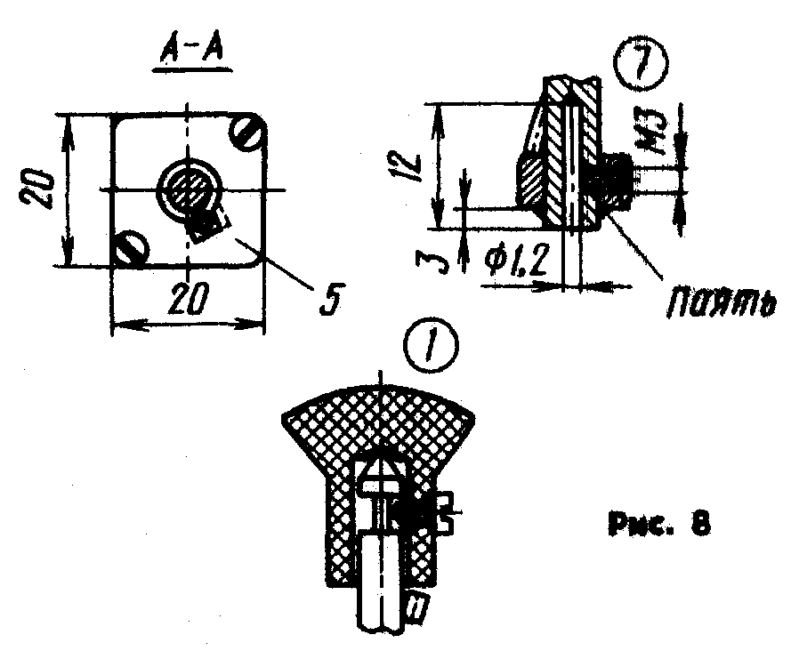 Стальной или латунный пруток 3 дидметром 5 мм и длиной 120,-.150 мм облуживают и припаичают к нему на одном конце гайку 7 (Мб). С торца в этом месте в прутке высверливают углубление диаметром 1,2 мм, а в гайке и прутке сверлят отверстие большего диаметра, а затем нарезают в нем резьбу МЗ под крепежную гайку-барашек 8.