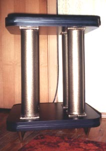 Пока это все были теоретические рассуждения. А колонки стояли на полу, басы гудели, пол дрожал, да еще и младшая дочка доросла до того, что стала в порты фазоинверторов закидывать свои игрушки. Последней каплей была бутылочка с молоком, которую мы искали дня три, пока жена не догадалась сунуть руку в колонку. Пришлось затыкать фазоинверторы резиновым ежиком (левый канал) и плюшевым зайчиком (правый). Ужас, короче, и пришла пора делать стойки. А тут, очень кстати, обнаружилось, что у одного из наших студентов отец работает на каком-то заводе и как раз с металлом. У него-то и заказали нужные трубы. Конструкция проста: стальная труба длиной 40 см, диаметром 7 см. По торцам приварены стальные квадраты с дырками по углам, в одном из квадратов дырка для засыпки песка. Пока делали трубы, я размышлял, как бы их покрасить, но не понадобилось. На заводе заодно и покрасили, причем под травленую бронзу, вид просто потрясающий.