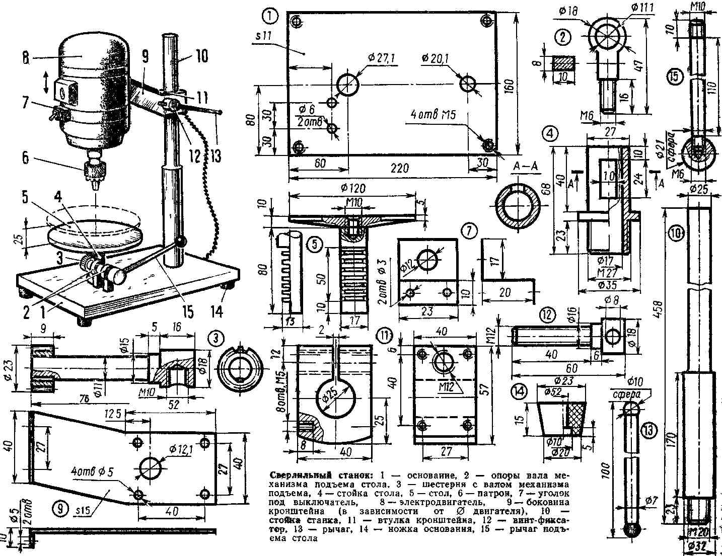 Основная трудность при создании самодельных саерлийькых станков — это изготовление механизма вертикального перемещения рабочего органа. А мто, если сделать станок совсем без этого механизма — так, чтобы подавать не патрон со сверлом, а саму деталь? В этом случае конструкция существенно упрощается. Не претендую на оригинальность своего решения, однако именно эта идея позволила мне спроектировать и изготовить станок, устройство которого показано на рисунке. Основанием служит стальная плита толщиной 11 мм, хотя вместо нее можно применить и другие материалы, например, текстолит (естественно, несколько увеличив его толщину). К основанию с помощью, гаек - М6, М20 и М27 крепятся стойки станка 10 и стола 4, в также опоры вала механизма подъема 2. На первой стойке установлен кронштейн, состоящий из двух боковин 9 из стального листа толщиной 1,5 мм и дюралюминиевой втулки 11. Кронштейн может быть закреплен в любой точке верхней части стойки (ход 265 мм) с помощью винта-фиксатора 12 и рычага 13. В стойке стола имеется прямоугольное отверстие размером 24 х 10 мм для входа зубьев шестерни 3. Сама шестерня посажена на вал и закреплена шпонкой. Рычаг подъема стола 15 соединяется с валом на резьбе М10. Величины подачи — 25 мм — вполне достаточно для выполнения большинства работ. Если же требуется отверстие большей глубины, то его можно сделать в два приема: сначала углубиться на 25 мм, а затем, несколько опустив кронштейн с двигателем, еще на столько же. Словом, станок позволяет сверлить отверстия любой глубины — насколько позволит длина сверла. Механизм подачи стола может быть и без шестерни и зубчатой рейки, а с простым рычажным управлением. Для этого в хвостовике стола свершится неглубокое отверстие диаметром, равным толщине рычага, а на стойке делается продольный выреэ. Подъем стола в этом случае осуществляется с помощью рычага, проходящего одним концом через вырез и упирающегося в отверстие хвостовика. Конструкция станка предлагаемой схемы позволяет применять электродвигатели различных типов. От их мощности будет зависеть и максимальный диаметр используемого сверла. Так, при двигателе в 50 Вт устанавливаемый патрон может работать с 6-мм сверлами, а при 120—150 Вт — с 9-мм. Для крепления патрона надо выточить переходник. Чертеже его не привожу, поскольку данный узел все равно придется подгонять под диаметр выходного вала имеющегося двигателя. И еще один совет: прежде чем включать станок в сеть, его необходимо надежно заземлить.