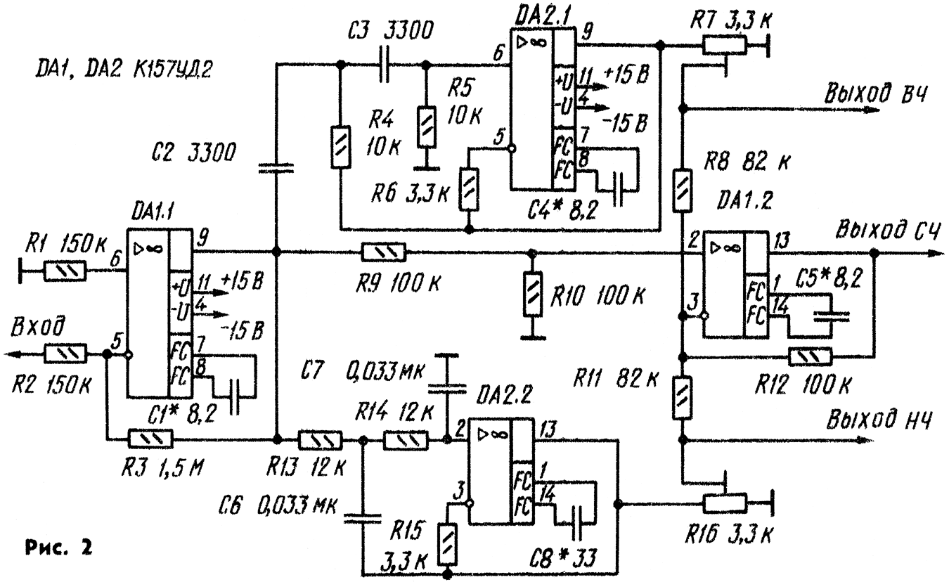 Известно, что характеристики динамических головок резко ухудшаются на краях их номинальных диапазонов частот, поэтому очень важно, чтобы на них поступало напряжение только тех частот, которые они могут воспроизвести с достаточной для слушателя верностью. Поскольку широкополосных головок, одинаково хорошо воспроизводящих весь диапазон звуковых частот, пока не выпускается, эту задачу решают введением в звуковоспроизводящий тракт пассивных (на выходе широкополосного УМЗЧ) или активных (на входе трехполосного УМЗЧ) разделительных фильтров. Для разделения полос в последнем случае используют разные способы. Например, в устройстве, описанном в [1], предварительная фильтрация сигнала - разделение на низко- (НЧ) и средне-высокочастотную (СЧ-ВЧ) полосы осуществляется фильтрами нижних (ФНЧ) и верхних (ФВЧ) частот, а в устройстве [2] - с помощью ФНЧ и так называемого фильтра дополнительной функции. Дальнейшее разделение сигнала (на СЧ и ВЧ полосы) обеспечивают в обоих случаях ФНЧ и ФВЧ.