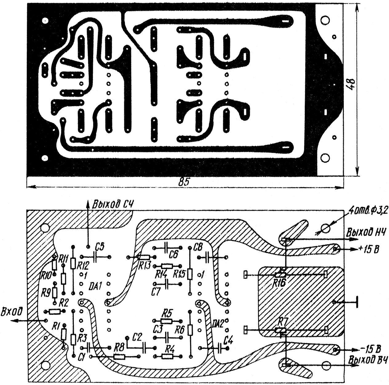 Блок фильтров собран на печатной плате (рис.3) из двустороннего фольгированного стеклотекстолита. Она расчитана на установку резисторов МЛТ и СП3-1А, конденсаторов К21-5 и К22-5 (с допустимым отклонением емкости от указанных на схеме номиналов не более ±10%). ОУ К157УД2 можно заменить на К544УД1, К544УД2 или К140УД8 с любым буквенным индексом. Для питания необходимо использовать стабилизированный источник с малыми пульсациями выходного напряжения.