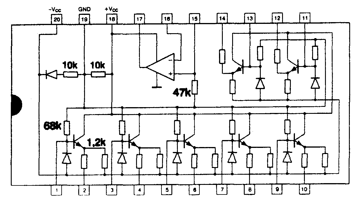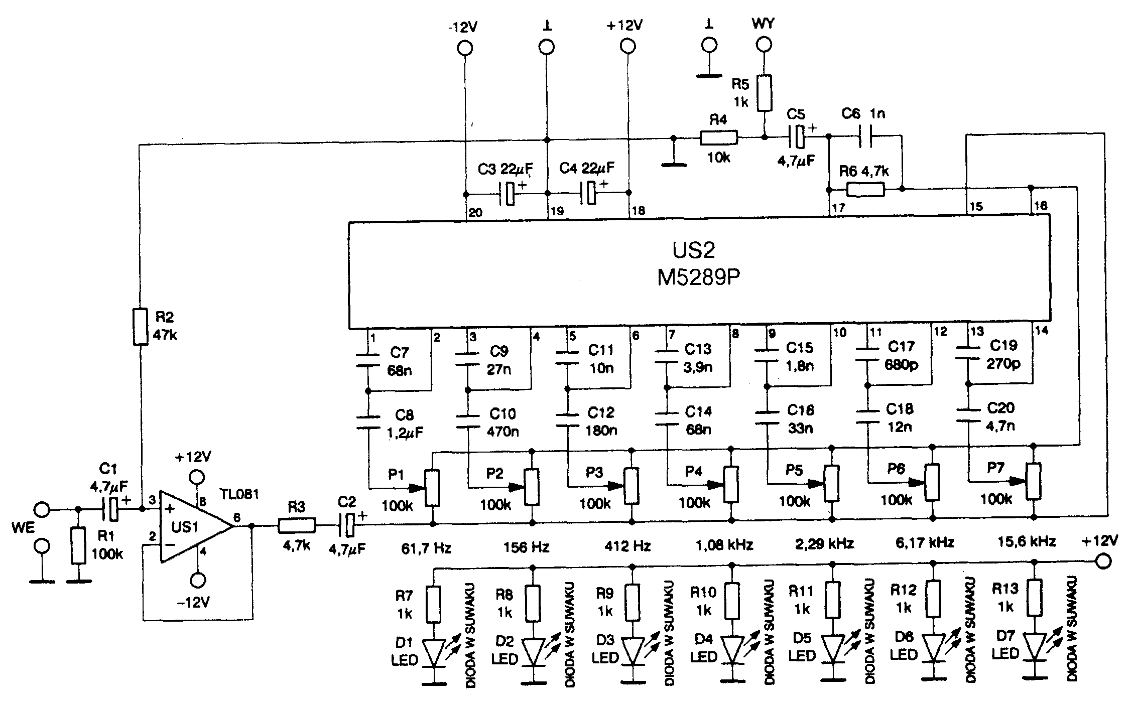 7-полосный графический эквалайзер (см. рис.1.) Дариуша Кубала выполнен на ИМС М5289Р (полный аналог AN7337N), эквивалентная схема которой показана на рис.2. Глубина регулировки АЧХ на частотах, указанных под соответствующими регуляторами на рис.1, составляет ±15 дБ, коэффициент гармоник (ивых = 1 В) не превышает 0,001%, напряжение собственных шумов 3,5 мкВ (в полосе частот 30 Гц - 30 кГц). По цепи +12 В устройство потребляет 90 мА (с учетом свето-диодов01 -D7), а по цепи -12 В всего 20 мА («Praktyczny Elektronik» № 4/01, с.9-13).