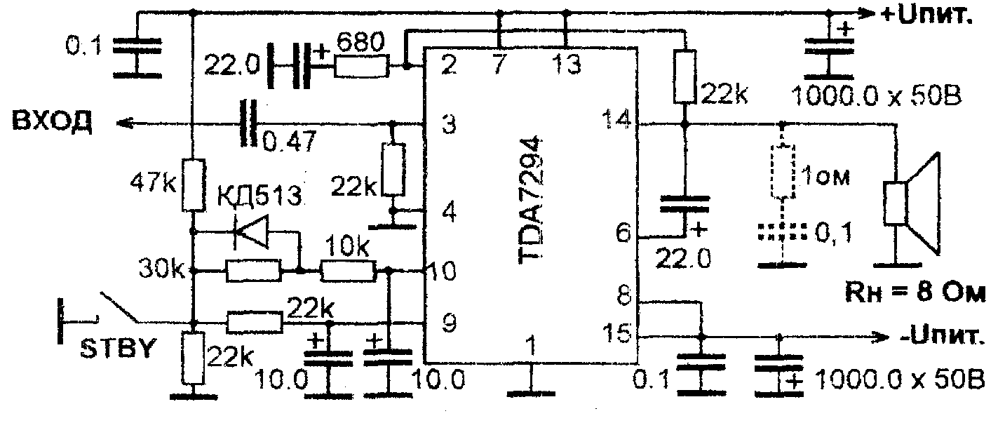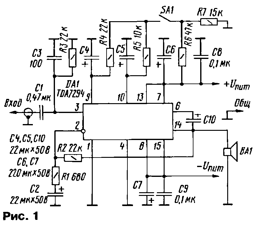 В статье А. Сырицо "УМЗЧ на микросхеме TDA7294" (см. "Радио", 2000, № 5. с. 19—21) была подробно описана эта микросхема и приведено несколько вариантов УМЗЧ с ее использованием. Вниманию читателей предлагается еще один вариант усилителя, в котором применена типовая схема включения TDA7294.