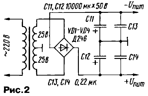 Усилитель имеет встроенную тепловую защиту, а также защиту от перегрузок и короткого замыкания в нагрузке. Для "мягкого" включения усилителя служит выключатель SA1. Устройство может питаться от двуполярного нестабилизированного источника, схема которого приведена на рис. 2.