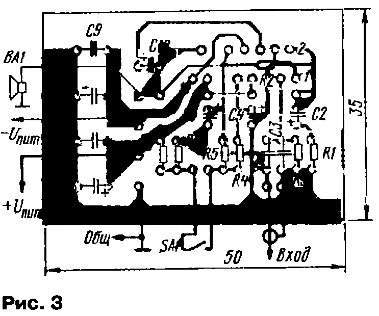 Мощность сетевого трансформатора — 250 ВА, вторичные обмотки должны быть рассчитаны на ток не менее 5 А. Детали усилителя смонтированы на печатной плате (рис. 3) из двустороннего фольгированного стеклотекстолита размерами 50x35 мм.