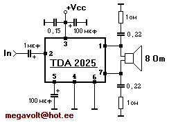 Интегральная микросхема TDA 2025 фирмы Philips представляет собой усилитель мощности НЧ с максимальной мощностью 50 W (U пит = 24В) на нагрузке 8 ом. Предназначена для примениния в магнитофонах, усилителях высокого класса.