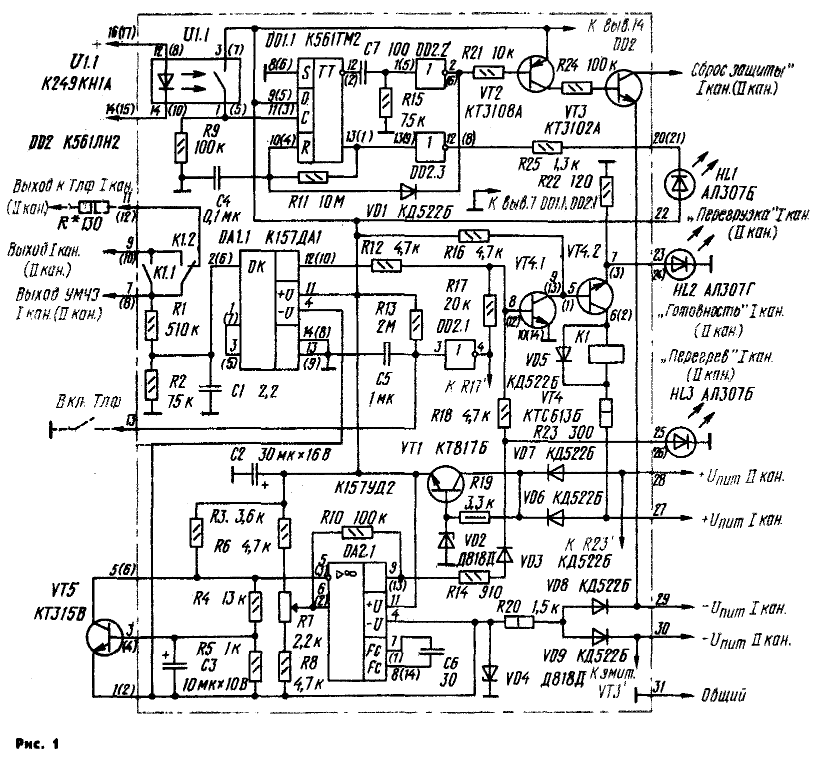 Принципиальная схема блока защиты приведена на рис. 1 (конструкционная часть предложена для двухканального усилителя, поэтому в скобках указаны номера выводов для элементов второго канала). Устройство автоматического возврата триггерной защиты в исходное состояние состоит из входного оптронного коммутатора U1.1, одновибратора на триггере DD1.1, каскада сдвига уровня на транзисторе VT2 и выходного ключевого каскада на транзисторе VT3. Работает оно следующим образом: при срабатывании триггера электронной защиты УМЗЧ входной оптронный коммутатор U1.1, подключенный вместо (либо последовательно) светодиода аварийного состояния УМЗЧ, создает на входе С одновибратора DD1.1 запускающий скачок напряжения. В результате заряда конденсатора С4 через резистор R11 положительным напряжением, появившимся на неинвертирующем выходе одновибратора OD1, до порогового значения, на его инвертирующем выходе возникает импульс отрицательной полярности длительностью ~0,2 с. По окончании этого импульса дифференцирующая цепочка C7R15 формирует на выходе буферного инвертора DD2.2 короткий (длительностью ~5 мкс) импульс отрицательной полярности, во время действия которого открывается выходной ключ на транзисторе VT3, отключается триггер электронной защиты УМЗЧ и восстанавливается исходное состояние одновибратора (конденсатор С4 разряжается через диод VD1 и открытый инвертор DD2.2). Если же причина перегрузки УМЗЧ не устранена, устройство его защиты срабатывает вновь и весь описанный здесь процесс повторяется. Аварийное состояние перегрузки индицируется светодиодом HL1. Задержку подключения АС к УМЗЧ при включении питания обеспечивают элементы: инвертор DD2.1, транзисторы VT4.1, VT4.2, конденсатор С2 и реле К1. При включении питания на выходе инвертора DD2.1 возникает высокий потенциал, который поддерживает транзистор VT4.1 открытым, VT4.2 закрытым, а реле К1 обесточенным. По мере зарядки конденсатора С5 (через 1...2 с) потенциал на выходе инвертора DD2.1 снижается и транзистор VT4.2 открывается. В результате срабатывает реле К1 и своими контактами К1.1 и К1.2 подключает АС к выходу УМЗЧ, нормальный режим работы которого индицируется светодиодом зеленого свечения HL2. При переключении на телефоны HL2 гаснет. При появлении на выходе УМЗЧ постоянного напряжения (>±1 В) на выходе двуполупериодного выпрямителя на микросхеме DA1.1 возникает положительный потенциал, вследствие чего реле К1 обесточивается и отключает АС от выхода УМЗЧ.