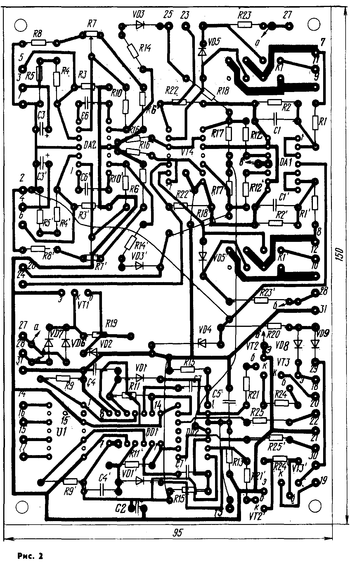 Оба канала блока защиты собраны на одной печатной плате из фольгированного стеклотекстолита (рис. 2). В нем использованы постоянные резисторы МЛТ-0,125, подстроечный (R7) — СП4-1. Допустимое отклонение номиналов резисторов R4 и R5 от указанных на схеме не более ±2 %, остальных — ±10%. Оксидные конденсаторы — К50-6, остальные — КМ. Реле К1 — РЭС48А, паспорт РС4.590.201. Оптронный коммутатор К249КН1А можно заменить на К249КП1 или на диодные оптроны серий АОД101, АОД109 и другие аналогичные. Вместо ОУ К157УД2 можно поставить КР140УД20 с соответствующими цепями коррекции, вместо микросхемы К561ТМ2 использовать К176ТМ2. Транзисторную сборку КТС613Б можно заменить сборками КТС631В, КТС631Г или же транзисторами серий КТ315 (VT4.1) и КТ815 (VT4.2). На месте транзистора КТ817Б (VT1) могут работать КТ815 и КТ817 с допустимым напряжением Uкэ не менее Uпит, транзистор КТ3108А (VT2) можно заменить любым маломощным кремниевым высокочастотным транзистором с напряжением Uкэ не менее Uпит (+9 В). Для УМЗЧ, описание которых приведено в [1] и [3], в качестве VT3 можно применить транзисторы KT315 с любым буквенным индексом, а для УМЗЧ, предложенного в [2], подойдут транзисторы КТ3102Б, КТ3102Е или КТ502 с Uкэ не менее удвоенного Uпит. Стабилитроны Д818Д могут быть заменены на Д818Е или КС191 с любым буквенным индексом, кроме «Ж», а диоды КД522Б — на любые кремниевые, маломощные с обратным напряжением не менее 50 В.
