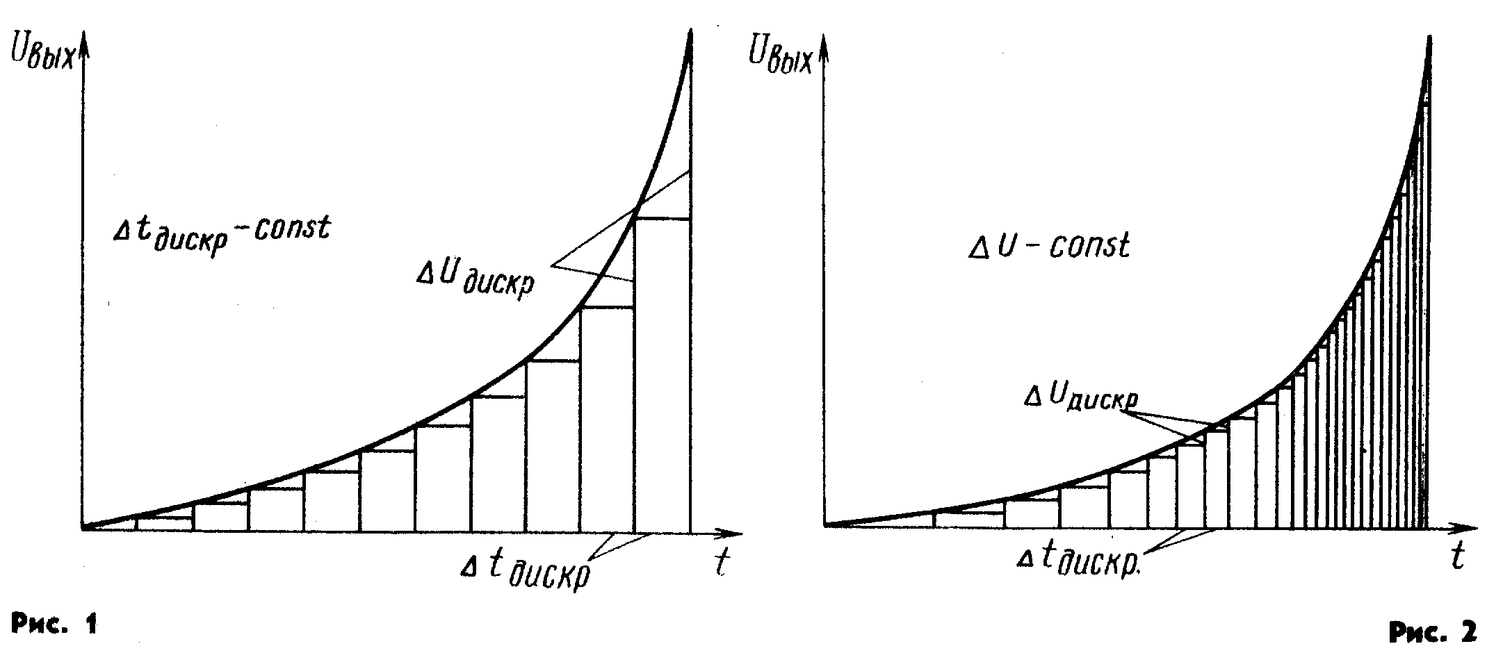Физиологические особенности акустического восприятия звука предъявляют вполне определенные требования к элементам конструкции. Так для равномерного регулирования громкости переменный резистор, реализующий эту функцию, должен иметь характеристику с экспоненциальной зависимостью изменения сопротивления (тип В) [1]. В устройствах электронного регулирования выполнение такого же требования достигается скоростью изменения амплитуды сигнала и может быть решено двумя способами: изменением приращения амплитуды дискретизации при постоянном времени дискретизации [2] (рис. 1) и, наоборот, изменением времени дискретизации при постоянном приращении амплитуды сигнала (рис. 2).