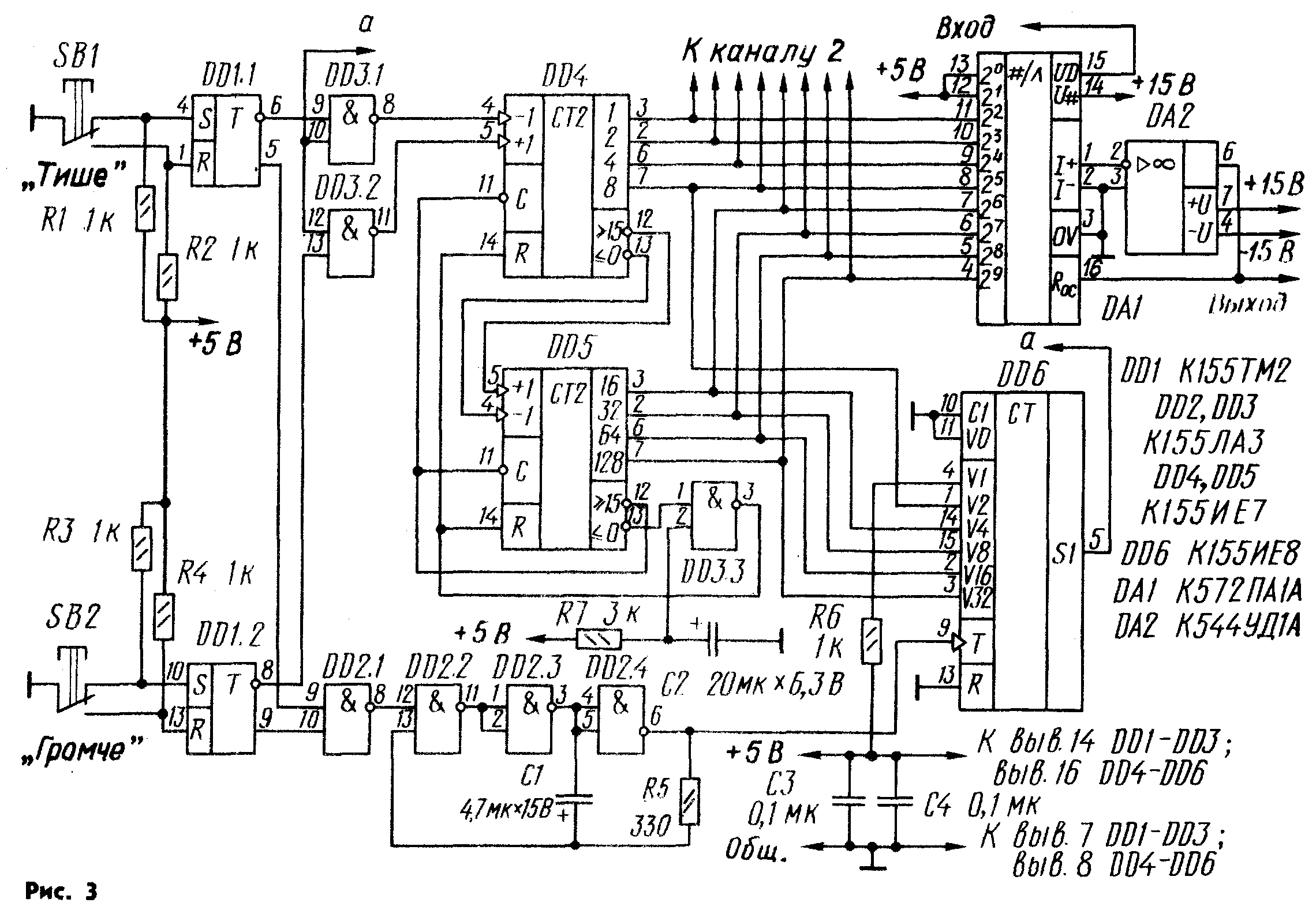 Регулятор громкости состоит из узла управления и двухка-нального (на схеме показан один канал) преобразователя «Код — громкость». Узел управления содержит две нефиксируемые в нажатом положении кнопки SB1 («Тише») и SB2 («Громче»), два устраняющих дребезг контактов RS-триггера на элементах микросхемы DD1, генератор тактовых импульсов с устройством его запуска на элементах микросхемы DD2, -восьмиразрядные счетчики на микросхемах DD4 и DD5 и управляемый делитель частоты на микросхеме DD6. Каждый из каналдв преобразователя «Код — громкость» состоит из ЦАП на микросхеме DA1 и суммирующего усилителя на ОУ DA2.