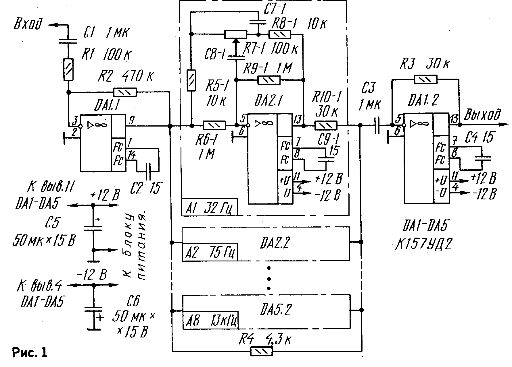 Ниже приводится описание восьмиполосного эквалайзера. Диапазон его рабочих частот 20...20 000 Гц; коэффициент передачи — 3...4; частоты настройки каждого из восьми фильтров указаны в таблице; добротность (отношение частоты настройки к полосе пропускания) фильтра — 1,12; диапазон регулировки коэффициента передачи — +12,5 дБ.
