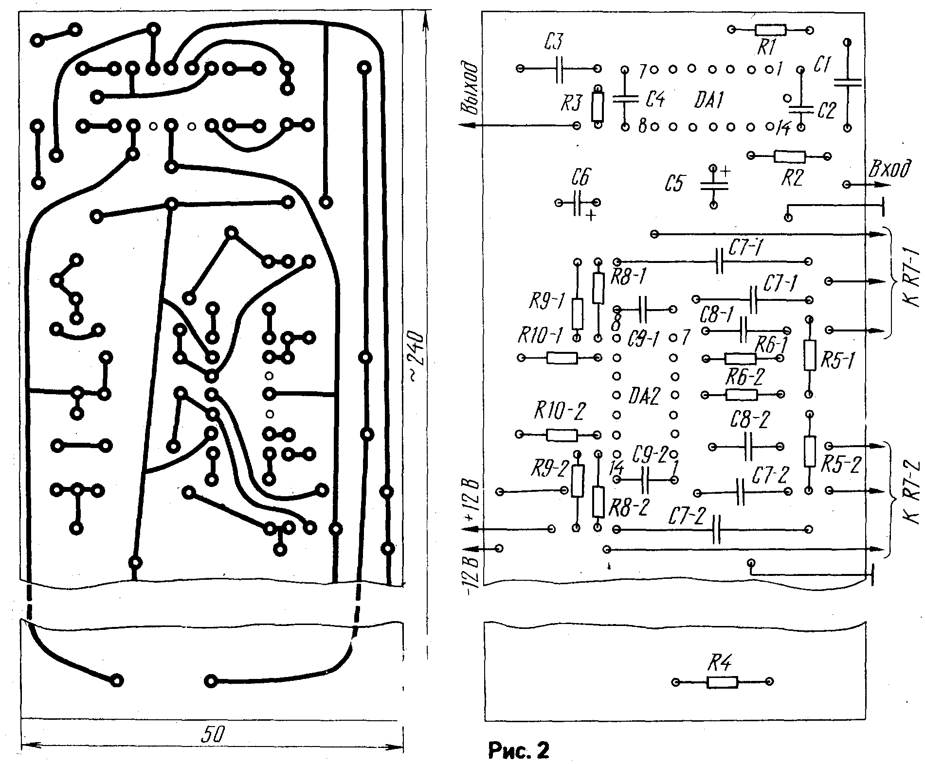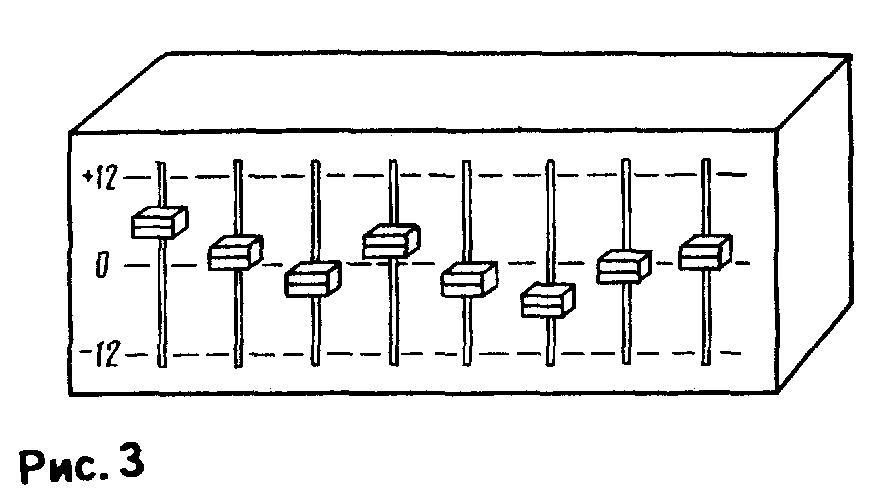 Все детали эквалайзера, кроме переменных резисторов, размещены на печатной плате из фольгированного текстолита, эскиз которой показан на рис. 2. В эквалайзере можно использовать постоянные резисторы ВС и МЛТ, конденсаторы К50-6 (С5,С6) и КЛС, КМ, МБМ (остальные), причем для фильтров следует отобрать конденсаторы с небольшим ТКЕ. Конденсаторы С7 и С8 составлены из двух-трех, включенных параллельно. Функциональные характеристики переменных резисторов должны быть линейными (группа А), они могут быть как движковые, с линейным перемещением, так и осевые. При использовании движковых резисторов (СПЗ-23А) можно сделать графический эквалайзер. Положение движков этих резисторов будет наглядно отражать АЧХ эквалайзера (рис.3). При применении осевых резисторов СП, СПО и т. д. качество устройства нисколько не ухудшится, но снизится наглядность регулировки АЧХ. Какого-либо специального налаживания эквалайзер не требует, необходимо только заранее подобрать емкости конденсаторов фильтра с точностью не хуже 5...1096. Для питания эквалайзера необходим двух-полярный стабилизированный блок питания напряжением 12...15 В и током до 50 мА.