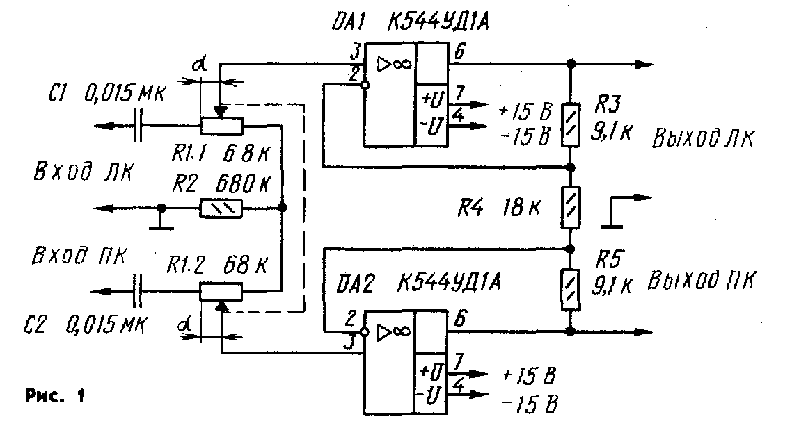 В статье Ю. Кузнецова, М. Морозова и А. Шитякова под таким названием («Радио», 1985, № 1, с. 27—28) было приведено описание устройства, которое, несмотря на свою относительную простоту, могло выполнять сразу две функции: снижения уровня рокота и улучшения разделения стереоканалов. Вместе с тем, как показал проведенный анализ схемотехнических решений, аналогичное устройство может быть построено с использованием значительно меньшего числа пассивных и активных элементов. Принципиальная схема такого регулятора, разработанного автором, приведена на рис. 1.