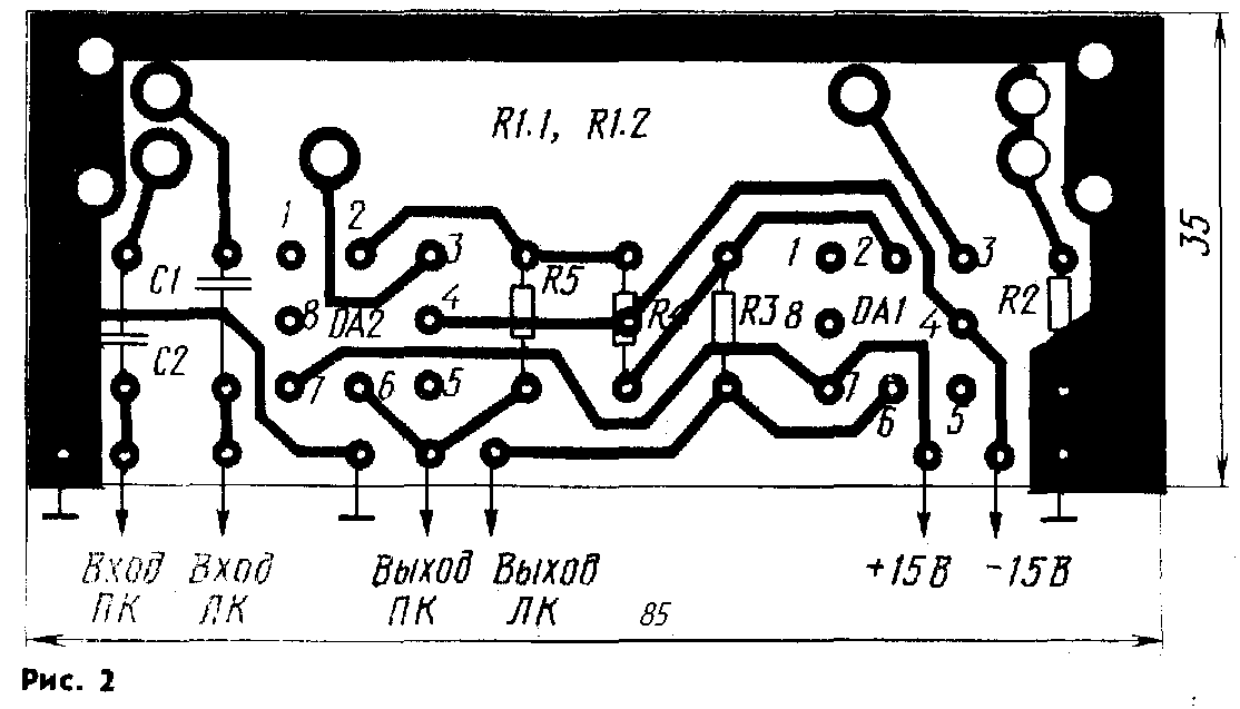 Чертеж печатной платы устройства, рассчитанной на установку резисторов МЛТ (R2 — R5), СПЗ-236 (R1), конденсаторов KM (Cl, C2), приведен на рис. 2. В налаживании правильно собранное устройство не нуждается. Следует отметить, что благодаря низкому выходному сопротивлению регулятор хорошо сопрягается с другими функциональными узлами стереотракта.
