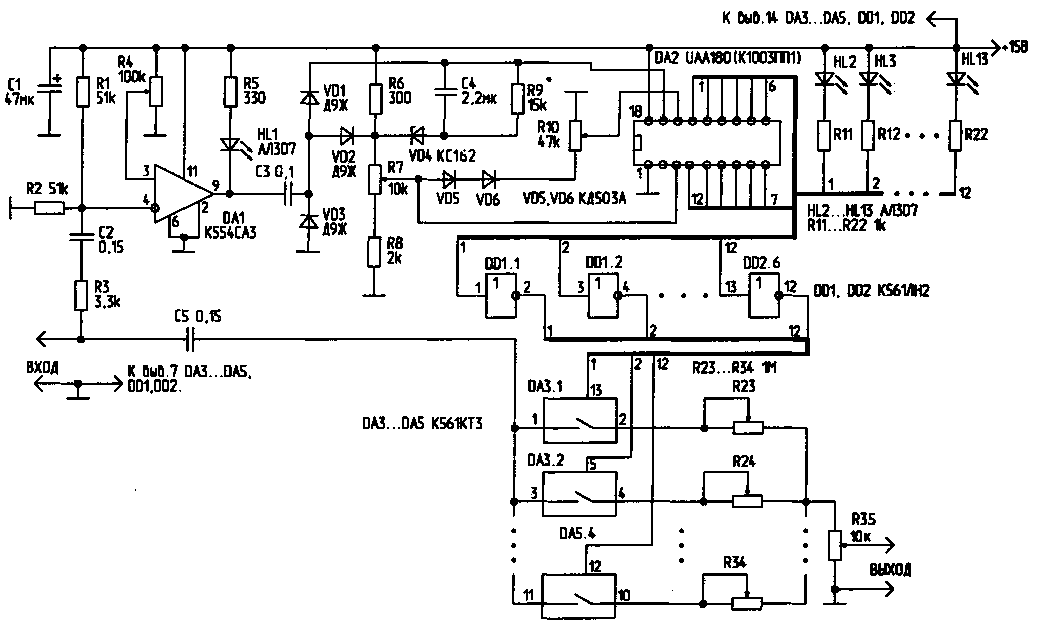 Схема простого бесфильтрового эквалайзера, имеющего 12 частотных каналов, приведена на рисунке. Формирователь прямоугольных управляющих импульсов выполнен на компараторе DA1. С выхода компаратора сигнал поступает на преобразователь "частота/напряжение", выполненный на основе элементов С3, С4, VD1, VD2, R9. Сигнал, напряжение которого пропорционально частоте входного сигнала, поступает на вход управления линейной светодиодной шкалой (вывод 17) микросхемы DA2. Сигналы, снимаемые с микросхемы DA2, через инверторы DD1, DD2 управляют включением 12 аналоговых ключей, выполненных на микросхемах DA3..DA5. Выходной сигнал эквалайзера формируется суммированием аналоговых сигналов по всем 12 каналам с раздельным регулированием частотных составляющих потенциометрами R23..R34.