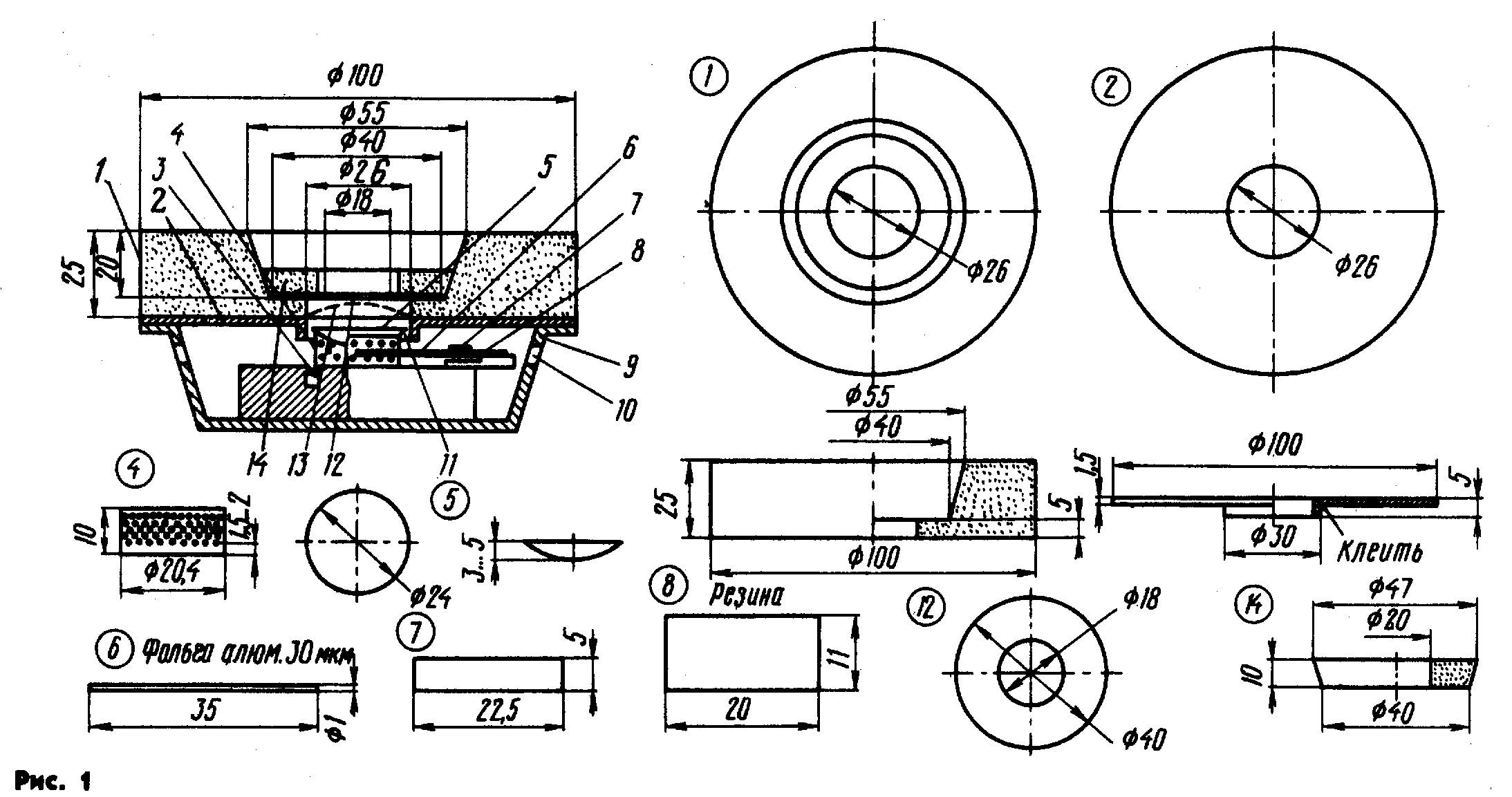 Сборочный чертеж и деталировка телефонов показаны на рис. 1. В данной конкретной конструкции была использована магнитная система от динамической головки 3 ГД-1 с диаметром керна 20 мм. Выбор магнитной системы не является принципиальным, однако следует иметь в виду, что если внутри магнитной системы имеется полость, образующая вместе с магнитным зазором резонатор Гельмгольца, то ее нужно заполнить любым плотным материалом (например пластилином), оставив минимальное пространство в области зазора для свободного перемещения звуковой катушки. Можно также просто отделить магнитный зазор от этой полости непроницаемой перегородкой.