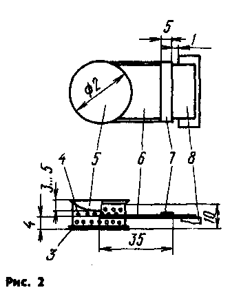 При изготовлении телефонов особое внимание следует уделить механической части преобразователя. Подвижная система состоит из излучателя 5, каркаса 4 и звуковой катушки 3. При изготовлении подвижной системы рекомендуется использовать цилиндр диаметром 20 мм (равен диаметру керна магнитной системы) и достаточной длины. На этом цилиндре и собирают подвижную систему. Поскольку диаметр цилиндра равен диаметру керна, цилиндр необходимо обмотать дополнительным слоем бумаги (или несколькими слоями в зависимости от ее толщины). Дополнительная толщина должна быть такой, чтобы звуковая катушка попала в середину магнитного зазора. Сначала из плотной бумаги толщиной 30...50 мкм на цилиндре склеивают каркас 4. В бумаге нужно предварительно просверлить приблизительно 120 отверстий диаметром 0,5...0,7 мм. Отверстия в каркасе необходимы для того, чтобы под излучателем не возник резонатор и создались необходимые условия для демпфирования на частоте основного механического резонанса. Подготовленную таким образом полоску бумаги наматывают в один слой на цилиндр и склеивают внахлест (ширина склейки 2 мм). При этом следует слегка прокручивать каркас в процессе высыхания, чтобы он случайно не приклеился к поверхности цилиндра. На высохший каркас в один или два слоя виток к витку наматывают звуковую катушку 3. Ее обмотка содержит 20 витков провода ПЭЛ 0,05. Лишнюю часть каркаса (ниже катушки) отсекают лезвием как можно ближе к катушке. Затем каркас аккуратно перемещают к торцу цилиндра так, чтобы верхняя кромка каркаса выдвинулась за пределы цилиндра ровно на столько, сколько необходимо для приклеивания к ней излучателя. Излучатель приклеивают выпуклостью к магнитной системе. Такая конструкция позволяет увеличить отдачу в области высших звуковых частот. После приклеивания излучателя собранную подвижную систему желательно в течение суток не снимать с цилиндра. Затем ее можно аккуратно снять, стараясь случайно не деформировать. Излучатель 5 изготавливают из алюминиевой фольги толщиной 10 мкм. Для этого из нее вырезают круг диаметром 24 мм, кладут его на плотную бумагу, лежащую на ровной твердой поверхности, и накатывают с помощью гладкого стального шара диаметром 15...20 мм. Накатка производится до тех пор, пока углубление не составит 3...5 мм и излучатель не приобретет сферическую форму. Подвижную систему фиксируют в пространстве с помощью специального гибкого подвеса, состоящего из двух держателей 6, соединенных жесткой перемычкой 7, связанной с гибкой пластиной 8, которая приклеена к магнитной системе. Держатели 6 имеют форму трубок диаметром 1 и длиной 35 мм, которые изготовлены из алюминиевой фольги толщиной 30 мкм. Они расположены параллельно друг другу и перпендикулярно оси подвижной системы. С одного конца они жестко приклеены к каркасу 4 в диаметрально противоположных его точках (рис. 2), а с другого конца — к жесткой перемычке 7, предварительно ,приклеенной к гибкой пластине 8. Перемычку можно изготовить из плотной бумаги толщиной 0,1,...0,2 мм. Гибкая пластина 8 изготовлена из резины толщиной 0,5...0,7 мм. После окончательной сборки механической части пластину 8 закрепляют на магнитной системе таким образом, чтобы в нейтральном положении звуковая катушка попала точно в магнитный зазор, а держатели были параллельны плоскости магнитной системы. При этом можн