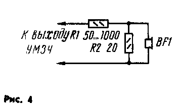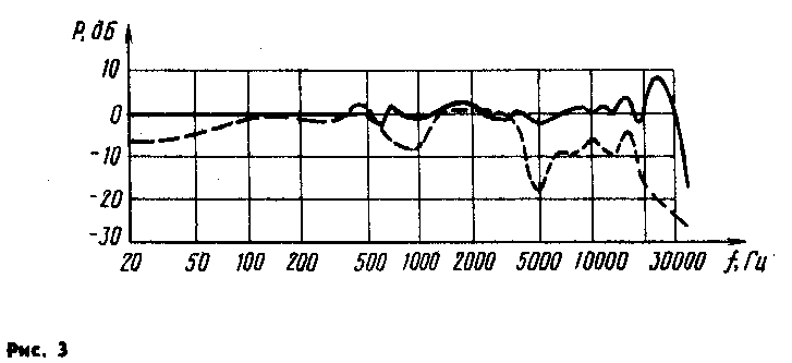 АЧХ описанных телефонов приведена на рис. 3 (сплошная кривая). Для сравнения здесь же приводится АЧХ одного из лучших образцов отечественных промышленных телефонов ТДС-7 (штриховая кривая). Общая неравномерность АЧХ предлагаемой конструкции не превышает 6 дБ. Она имеет плавную форму в отличие от АЧХ телефонов ТДС-7, которая имеет спад в области низших частот 6...8 дБ и спад в области высших частот 15 дБ. Общая неравномерность АЧХ ТДС-7 составляет 15 дБ.
