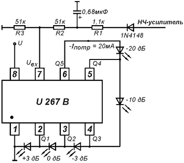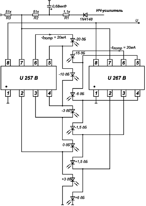 Возможны замены: 1N4148 > КД512А; светодиоды типа АЛ307Б, АЛ307В; U267B > ИМС линейной шкалы