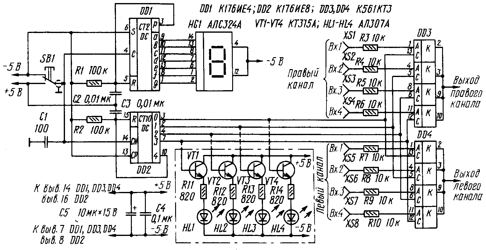 В коммутаторе можно использовать и способ индикации подключаемых входов с помощью светодиодов HL1 — HL4 (часть схемы, обведенная штрих-пунктирной линией), при этом надобность в микросхеме DD1 и индикаторе HG1 отпадает. При монтаже вместо микросхемы К176ИЕ8 можно использовать К561ИЕ8, К561ИЕ9. Микросхему К561КТЗ вполне заменит К176КТ1, но при этом примерно в пять раз увеличатся нелинейные искажения.