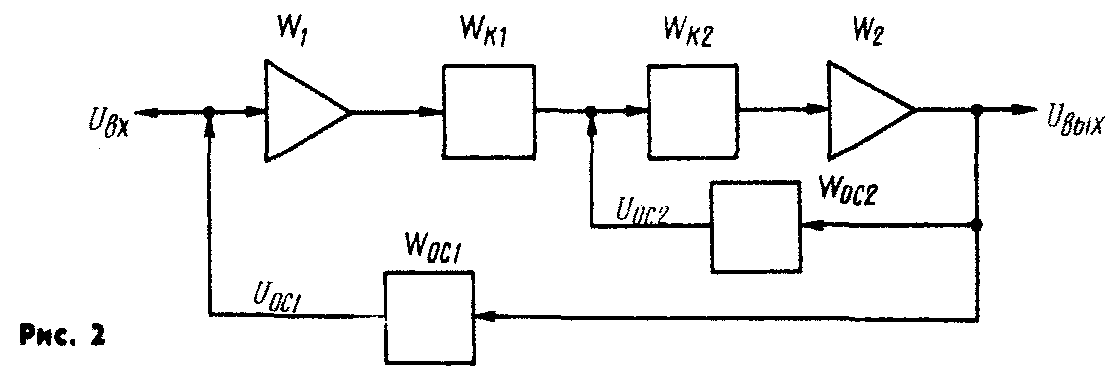 Чтобы ответить на этот вопрос, рассмотрим модель типового УМЗЧ в области звуковых частот (рис. 2). Выходные каскады усилителя W2 охвачены местной ООС (звено с частотной передаточной функцией WOC2), а усилитель в целом — частотно-зависимой ООС (звено с передаточной функцией WOC1). Для улучшения динамических свойств усилителя в [2, 3] предлагается основную коррекцию вводить в цепь главной ООС (WOC1).
