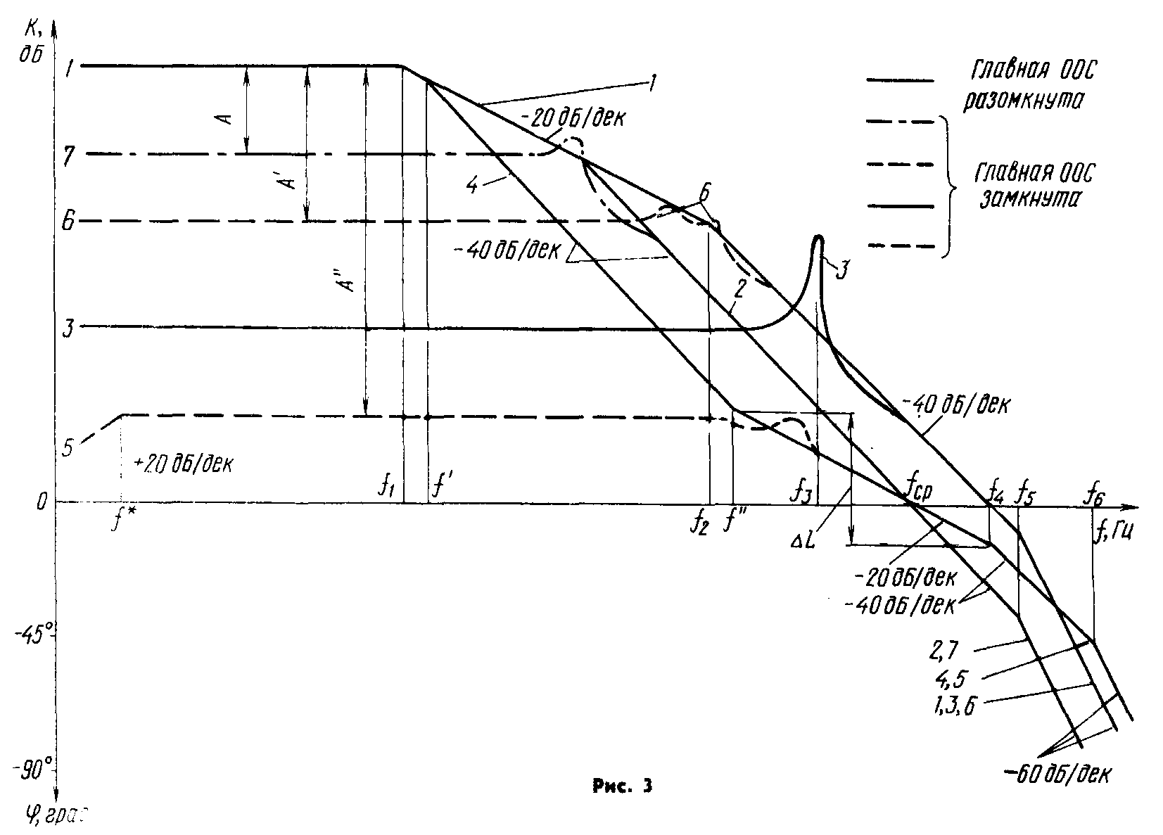 В настоящее время хорошо зарекомендовал себя метод с использованием ЛАХ стандартного вида [9]. На динамической характеристике устройства наиболее сильно отражается коррекция среднечастотного участка ЛАХ (на низших частотах действует ООС, на высших мало усиление). Одной из стандартных ЛАХ является ломаная с наклоном —40...—20...—40 дБ/дек в области средних частот (ломаная 4). Протяженность участка с наклоном —20 дБ/дек в наибольшей мере определяет качество переходного процесса [4, 6]. Участки с наклоном —40 дБ/дек служат для сопряжения с исходной характеристикой 1. Разработана методика расчета частот изломов ЛАХ (ломаной 4) по требованиям к динамической характеристике [5]. Автор использовал ее применительно к УЗМЧ. Представляется, что этот способ имеет ряд преимуществ перед рассмотренными выше. В этом случае за счет глубокой ООС (А">40 дБ) расширится полоса рабочих частот усилителя, а следовательно, и диапазон действия ООС на высоких частотах. Требования к запасу устойчивости усилителя и форме переходного процесса также удовлетворяются. Для получения АЧХ 4 необходима компенсация частот изломов f2 и f5 введением цепей коррекции в звенья с частотными передаточными функциями WOC1 и WК2. При этом результирующие частоты изломов f4 и f6 почти не будут влиять на динамические свойства усилителя. Важно стремиться к тому, чтобы полученная АЧХ не имела точек, где ее наклон изменяется более чем на ±20 дБ/дек, это обеспечит ее равномерность. Повышенное внимание следует уделить выбору частот первого и второго полюсов АЧХ f и f", поскольку их соотношение определяет запасы устойчивости УМЗЧ и частоту среза его АЧХ f . Нужные частоты f и f" можно получить, осуществив коррекцию в звене с частотной передаточной функцией WK1. О выборе корректирующих звеньев и методике построения АЧХ (ломаной 4) достаточно подробно рассказано в [2, 5]. Наименьшее значение для f целесообразно принять равным 20... 30 кГц, так как в этом случае сохранится достаточная глубина общей ООС на рабочих частотах УМЗЧ. Поскольку вид переходного процесса в УМЗЧ в значительной степени определяется протяженностью средне-частотного участка его АЧХ —20 дБ/дек (ломаная 4) и связанной с ней величиной перепада /_\L (рис. 3), значение последней следует выбирать не менее 10... 15 дБ [5, 6]. Полоса пропускания УМЗЧ при замыкании главной ООС должна перекрывать значение f". Это требование ограничивает выбор f", и его выполнение обеспечивает достаточную равномерность АЧХ собранного УМЗЧ в диапазоне частот f...fcp. Непременным условием применимости рассмотренного метода повышения устойчивости УМЗЧ является необходимый запас его усиления при разомкнутой цепи главной ООС (не менее 60 дБ) и, как уже говорилось, достаточная линейность (Кг < 5 %). При несоблюдении этих условий эффективность метода резко снижается, поскольку выбор частот f и f" выходит за рамки указанных ограничений. Недостаточная линейность не позволит однозначно судить по АЧХ о качестве переходного процесса и потребует более сложного исследования [4, 6|.