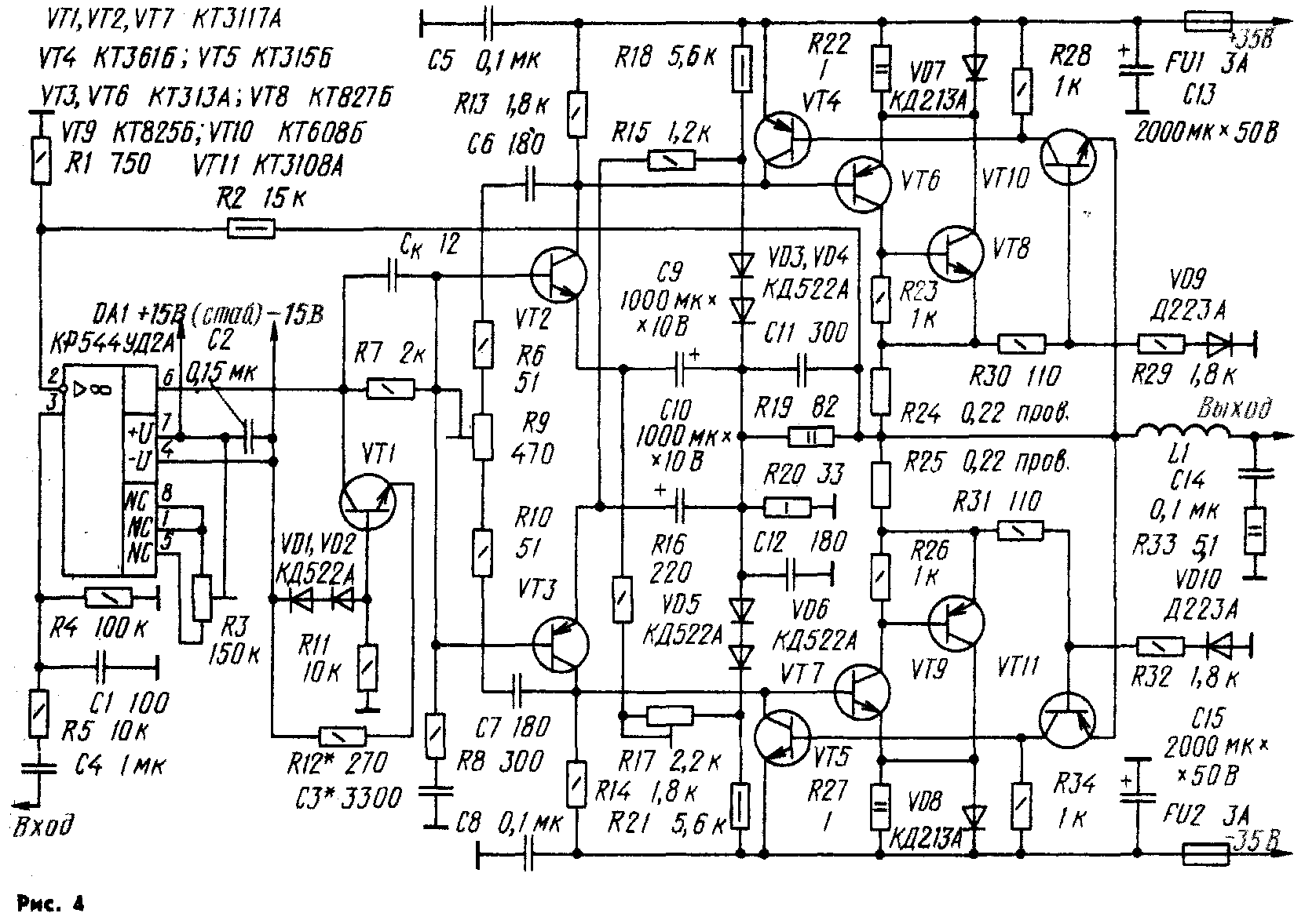 В результате расчета схема исходного усилителя несколько изменилась (рис. 4). Коррекция проводилась в полном соответствии с изложенной выше методикой. Сначала рассчитывалась коррекция выходных каскадов. Их ЛАХ до включения местной ООС имеет три излома и пересекает ось частот под наклоном —60 дБ/дек. Введение местной ООС компенсирует излом на частоте f2—2,5...3 кГц, а компенсация излома на частоте f5 достигается включением в цепь местной ООС конденсатора С12. Равномерность АЧХ выходного каскада в области высоких частот обеспечивает конденсатор С11 (он осуществляет сопряжение горизонтальной линии 20lg R19/R20 ЛАХ с наклонной —40 дБ/дек вблизи частоты f5. Таким образом, вид ЛАХ выходных каскадов соответствует ломаной с наклоном 0...—20...—40 дБ/дек (на рис. 3 не показана). ЛАХ ОУ имеет два излома: на частотах f1 = = 250....300 Гц и f6=11...12 МГц, причем последний изменяет наклон сразу на —40 дБ/дек. Для придания ЛАХ усилителя с разомкнутой цепью главной ООС, вида ломаной 4 введен корректор С3, Ск, R7, R8. Конденсатор Ск уменьшает изменение наклона на частоте f6 до —20 дБ/дек. Частоты изломов f и f" выбраны равными: f = 1/2лR7С3=24 кГц, f" = = l/2лR8C3=160 кГц. Глубина коррекции на частоте f" составляет около 20 дБ. Для симметрирования плеч усилителя на частотах выше частоты среза fcp=2,7...2,8 МГц служит цепочка C6R6R9R10C7. Входной фильтр R5C1 настроен на частоту, близкую к f", выходной L1C14R33 построен по обычной схеме и особенностей не имеет. С целью снижения искажений, вносимых каскадом на транзисторах VT2, VT3, увеличены емкости конденсаторов С9 и С10. Для улучшения шумовых характеристик УМЗЧ снижены сопротивления резисторов цепи главной ООС. Из нее исключен разделительный конденсатор. При этом излом АЧХ, имевший место на частоте f*=l/2лR1C2 в прежнем усилителе [10], исчезает (см. рис. 3). В результате снижается неравномерность АЧХ и ФЧХ УМЗЧ на низких и инфранизких частотах.