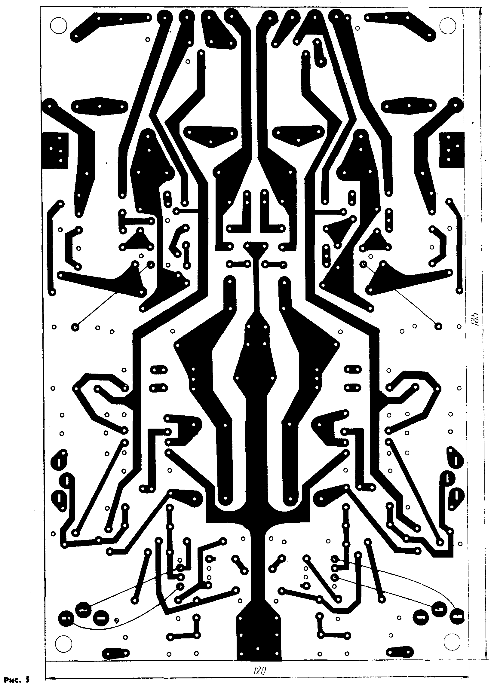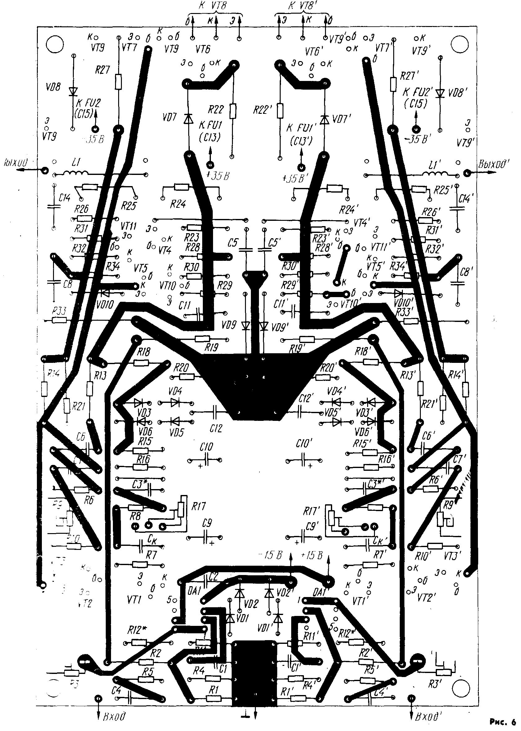 УМЗЧ собран на печатной плате из двустороннего фольтированного стеклотекстолита толщиной 2 мм (рис. 5). В нем использованы подстроечные резисторы СП5-2ВА (R17) и СПЗ-16 (R3, R9), постоянные ОМЛТ (R22, R27, R33) и МЛТ (остальные). Резисторы R24, R25 — проволочные. Конденсаторы КМ (С2, С4, С5, С8 и С14), К50-6 (С9, СЮ, С13, С15), КТ (остальные). Вместо указанных на схеме можно использовать транзисторы КТ3102А (Б) (VT2), КТ3107А (И) (VT3), КТ3108А (VT6), КТ635Б и КТ646А (VT7). Транзистор КТ3117А можно заменить КТ3117Б. Транзисторы VT8 и VT9 (VT8' и VT9'), а также конденсаторы С13 и С15 (С 13' и С15' ) расположены в непосредственной близости от печатной платы. Выходные транзисторы размещены на теплоотводах с площадью рассеивающей поверхности 600 см2 каждый. В качестве общей шины УМЗЧ использована луженая полоса из фольгированного стеклотекстолита шириной 20 мм, соединенная с элементами УМЗЧ короткими проводниками. К ней подпаяны общий провод нагрузки, конденсаторов С13, С15, источников питания +35 В, стабилизатора напряжения ±15 В и предварительного усилителя. Общий провод входных цепей послед -него отделен от шины цепочкой из резистора сопротивлением 10 Ом и конденсатора емкостью 0,01 мкФ, включенных параллельно [12]. Входной сигнал и напряжение питания ±15 В подаются на плату УМЗЧ по экранированным проводам, оплетка которых припаяна к общей шине со стороны общего провода предварительного усилителя. Провода, идущие к источнику питания + 35 В, к выходным транзисторам и к громкоговорителю, должны быть соответственно свиты по два [3] и иметь возможно меньшую длину.
