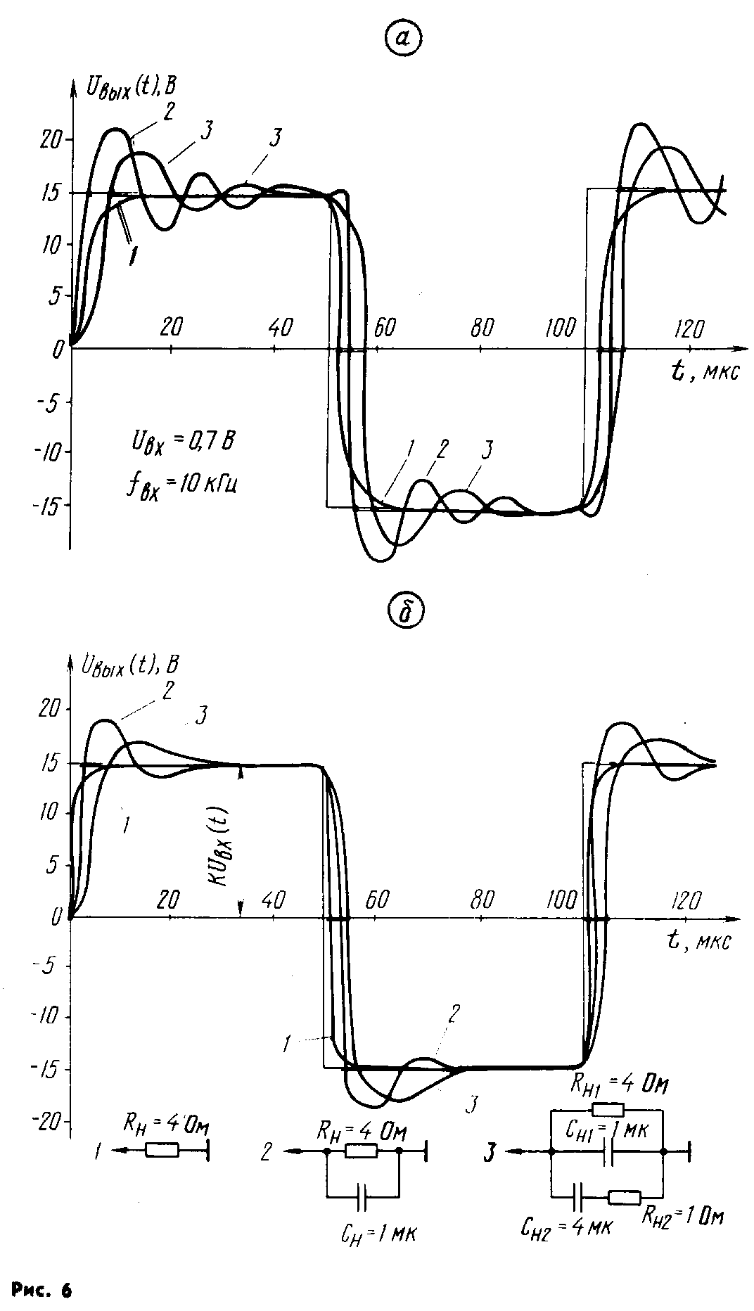 Налаживание УМЗЧ подробно освещено в [10]. Дополнительно, подав на вход усилителя прямоугольные импульсы амплитудой 0,5...0,8 В, необходимо снять характеристики переходного процесса (рис. 6, а — УМЗЧ [10]; б —УМЗЧ доработанного).