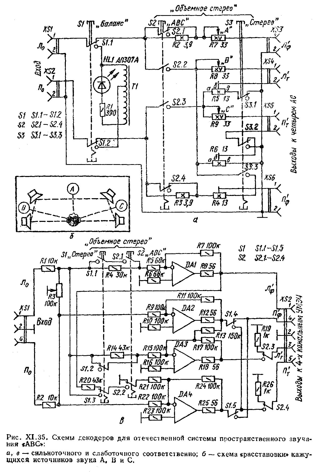 Налаживание сильноточного декодера проводят в режиме «ABC» (нажата кнопка S2) при подключенных к его выходам эквивалентных нагрузках, сопротивления которых равны номинальным входным сопротивлениям АС на частоте 1000 Гц. Для этого удобно использовать резисторы ПЭВ-25 или ПЭВР-25. Соединив декодер с выходом стереофонического УМЗЧ, включенного в режим «Моно», и подав на входы усилителя напряжение частотой 1000 Гц, измеряют сигналы напряжением Л0 и П0 на входе декодера и, если они отличаются более чем на 10%, балансируют каналы регулятором стереобаланса. (В процессе эксплуатации для этого пользуются светодиодным индикатором декодера при ненажатых кнопках S2, S3). Движок резистора R4 устанавливают в среднее положение и резистором R7 добиваются равенства сигналов на разъемах XS3 и XS6, соответствующих левому и правому фронтальным каналам (баланс «А»). Переключают УМЗЧ в режим «Стерео» и убирают сигнал со входа правого канала, движком подстроенного резистора R8 устанавливают равными напряжения на разъемах XS4 и XS3 при среднем положении движка резистора R5 (баланс «В»). После этого сигнал со входа левого канала переключают на вход правого, устанавливают движок резистора R6 в среднее положение и движком переменного резистора R9 добиваются равенства сигналов на разъемах XS5 и XS6 (баланс «С»). Не убирая сигнала со входа правого канала, подстроечным резистором R5 добиваются того, чтобы сигнал на разъеме XS4 стал равен 0,7 сигнала на разъеме XS6 и, снова подав испытательный сигнал на вход левого канала, подстрочным резистором R6 устанавливают такое же соотношение между сигналами на разъемах XS5 и XS3: UXS5 = 0,7UXS3. B ходе этих регулировок становятся сбалансированными в заданных соотношениях сигналы, поступающие на левый и правый фронтальные и левый и правый тыловые громкоговорители (АС). При подготовке декодера к работе переменными резистордми R7, R8 и R9 проводят «расстановку» КИЗ A, B и C (рис. XI.35,б) в серединах соответствующих баз, прослушивая специальные испытательные сигналы А, В и С. При воспроизведении обычных стереозаписей пространственную панораму по вкусу слушателя создают регуляторами R7—R9. Для получения наилучшего качества звучания все четыре АС должны быть одинаковыми, при отсутствии такой возможности в качестве фронтальных устанавливают более качественные АС.