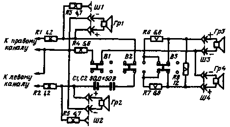 Конденсаторы С1 и С2 .ограничивают полосу частот сигнала. поступающего на дополнительные головки и она составляет 500-5000 (8000) Гц. Выбор режима работы установки (стереофония или псевдоквадрафония) производится кнопочным переключателем В2. Переключателем В3 изменяют уровень сигнала на дополнительных головках. В левом, по схеме, положении переключателя В1 головки Гр3 и Гр4 кроме разностного сигнала излучают часть основного сигнала, а в правом положении - только разностный сигнал.