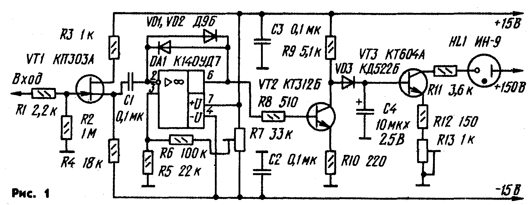 В индикаторе можно использовать любые резисторы и конденсаторы. Транзистор КПЗ0ЗА заменим КПЗ0ЗВ, КПЗ0ЗЖ, КПЗ0ЗИ, КТ604А - КТ604Б, КТ605А и КТ605Б, а КТ312Б - любым кремниевым транзистором соответствующей структуры с допустимым напряжением коллектор-эмиттер не менее 30 В. Вместо диодов Д9Б рекомендуется использовать любые серий Д2 и Д9, а вместо КД522Б — любые высокочастотные кремниевые. Кроме К140УД7, подойдут К153УД2 и К153УД6 или аналогичные с соответствующими цепями коррекции. Функции индикатора может выполнять индикатор тлеющего разряда ИН-13.