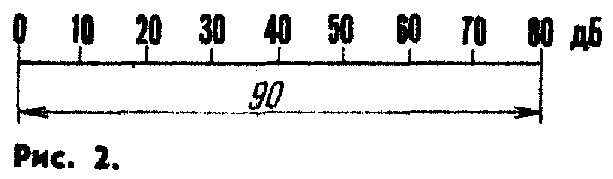 Перед настройкой индикатора необходимо изготовить шкалу. Рекомендуемый диапазон индикации 80 дБ. Нуль шкалы наносят против того места, где начинается горящий столб индикатора, а максимальную отметку — на расстоянии 90 мм от нуля. Всю шкалу делят на восемь равных частей (рис. 2). Настройку производят по двум точкам шкалы — 40 и 80 дБ. Для этого с генератора звуковых частот на вход индикатора подают сигнал частотой 1 кГц и амплитудой, соответствующей максимальной выходной мощности УМЗЧ. Резистором R13 горящий столб индикатора устанавливают против отметки шкалы 80 дБ. Затем входной сигнал уменьшают на 40 дБ (100 раз по амплитуде) и резистором R7 устанавливают горящий столб уже против отметки 40 дБ. Эти операции повторяют до тех пор, пока показания индикатора не будут соответствовать отметкам 40 и 80 дБ без дополнительных регулировок. При такой настройке разбаланс для двух индикаторов, изготовленных без подбора элементов, не превышает 5...7 мм.