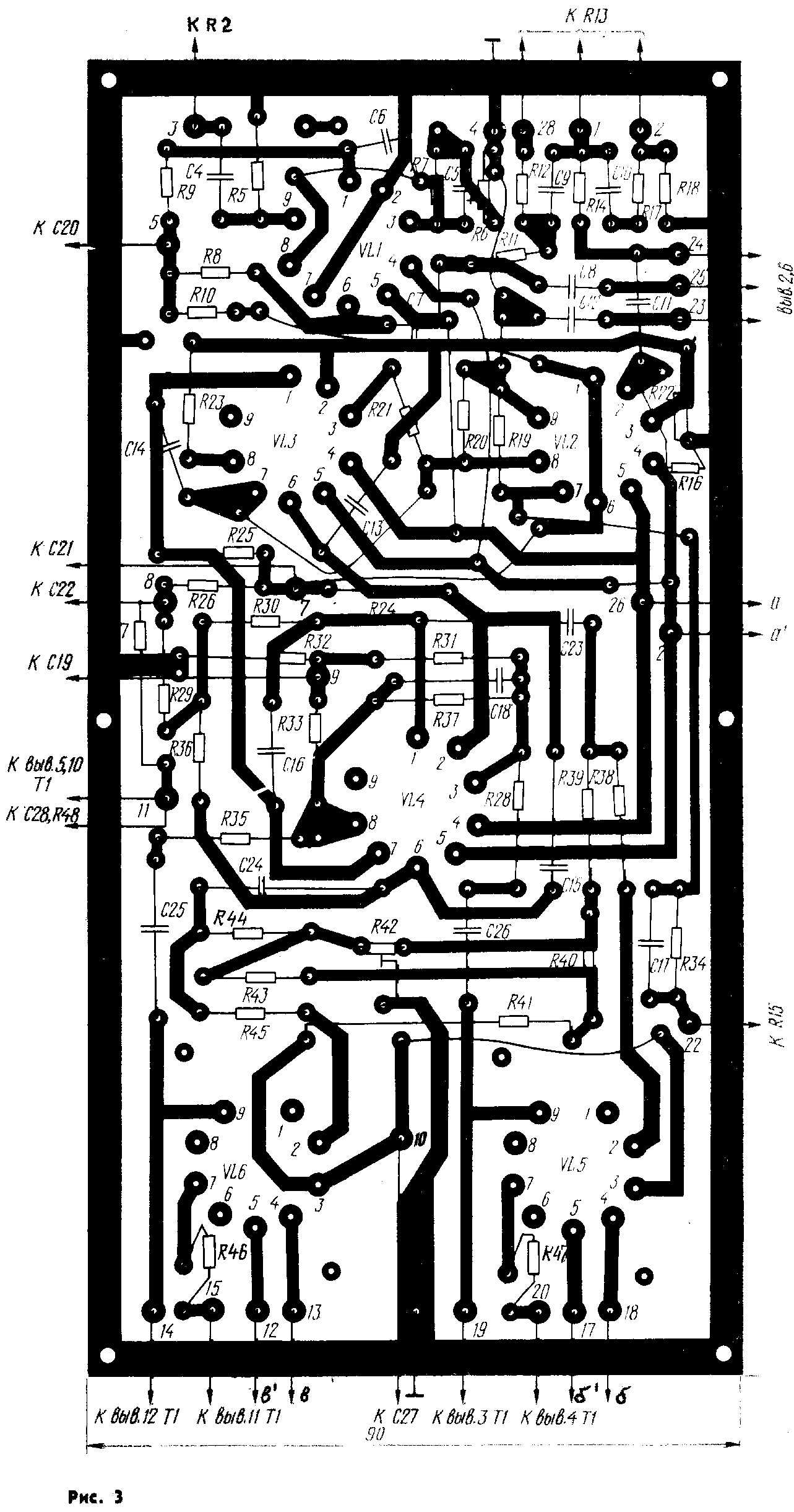 УМЗЧ смонтирован на печатной плате из фольгирован-ного стеклотекстолита толщиной 1,5 мм (рис. 3). Для монтажа использованы постоянные резисторы МЛТ, переменные СЗ-ЗОв-В (Rl, R2, R13, R15), СЗ-ЗОа (R22) и С5-5 (R42), конденсаторы К50-12 (С19—С22, С27—С29), К73-5 (С23—С26), КТ (С13— С16) и КМ (остальные). Выходной трансформатор выполнен на броневом ленточном магнитопроводе ШЛ 25X40 (толщина ленты 0,1 мм). Можно использовать и Ш-образный магнитопровод из пластин Ш25 и толщиной набора 40 мм. Обмотки 1—2 и 13—14 содержат по 50, а 6—7—8—9 — 15+15+15 витков провода ПЭВ-2 1,0, обмотки 5—4—3 и 10—11 — 12 состоят из 600+800 витков провода ПЭВ-2 0,2. При намотке выходного трансформатора необходимо обеспечить строгую симметрию половин его первичной обмотки, разделив каркас на две одинаковые части перегородкой, параллельной боковым щечкам [4, с. 75].