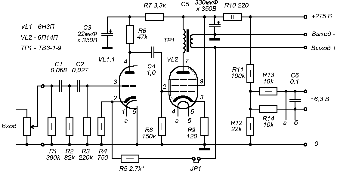 О замене ламп. Наиболее близкой по параметрам к лампе 6П14П является 6П18П. Фактически лампы очень близки (при отсутствии маркировки их не отличить вообще) и различаются лишь, если верить справочнику, номинальным напряжением на аноде, которое у 6П18П составляет 170 В при максимально допустимом 250 В. Однако 6П18П прекрасно работает и при более высоких напряжениях и может быть установлена вместо 6П14П без каких-либо изменений в схеме. К сожалению, на этом список ламп, пригодных для такой замены заканчивается - для остальных ламп необходим подбор катодного резистора. Наиболее близкие по параметрам к 6П14П лампы: