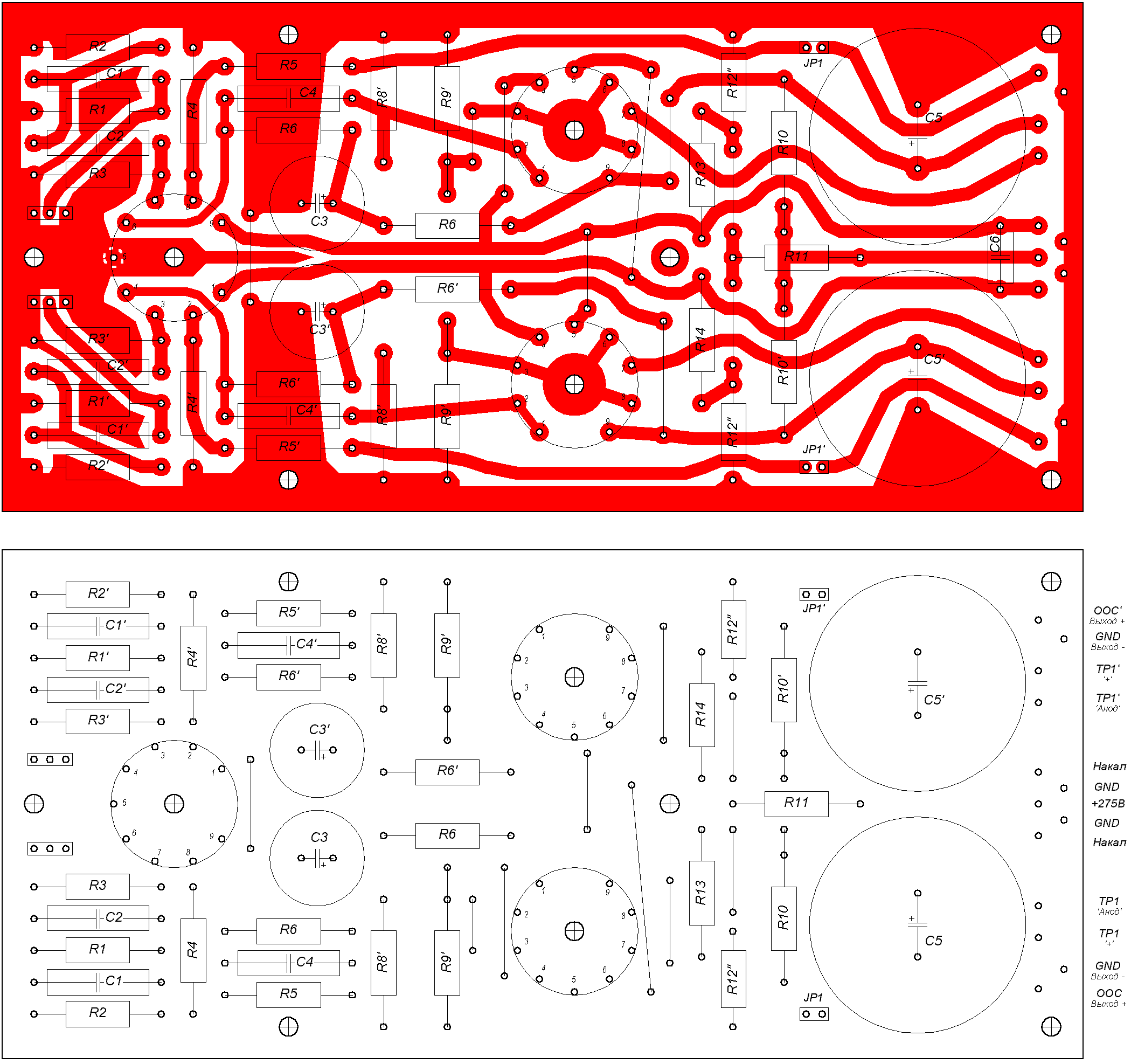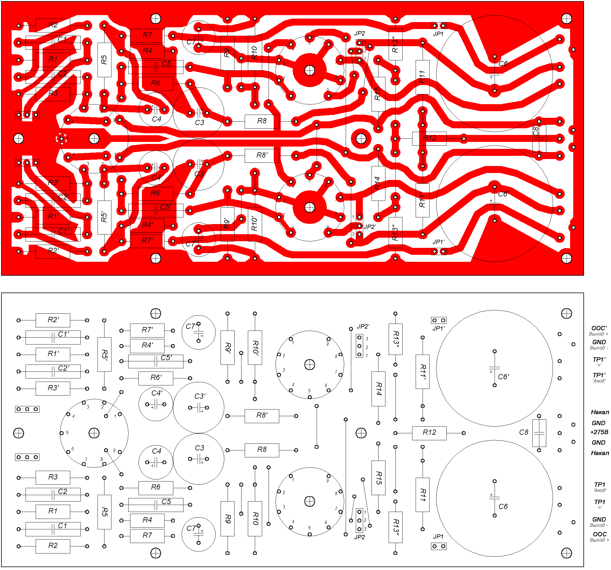 Конструкция и детали. Оба канала усилителя, кроме блока питания, целиком смонтированы на одной печатной плате ( рис.3 ). Так как лампы рассеивают достаточно много тепла, стремиться получить высокую плотность монтажа нет смысла. По этой же причине в качестве материала для печатной платы желательно применить фольгированный стеклотекстолит - этот материал более температуростоек, чем текстолит или гетинакс, и при нагреве не деформируется, что часто случается с платами на основе гетинакса. Резисторы могут быть типов ВС или МЛТ. R1-R5, R13 и R14 могут быть любой мощности (печатная плата расчитана на установку резисторов типа ВС-0,5 и МЛТ-0,5), R6, R7, R8, R11 и R12 лучше взять мощностью не менее 0,5 Вт (для R7 и R8 это обусловлено не столько рассеиваемой на них мощностью, сколько возможностью "прострела" между витками нарезки в момент подачи питания на усилитель). R9 должен быть мощностью не менее 1 Вт, R10 - 2 Вт. R10 лучше всего взять проволочный - также из-за возможного пробоя в момент включения, но в крайем случае подойдет и МЛТ-2. Сопротивления резисторов R1, R11-R14 могут значительно отличаться от указанных на схеме: R1 может быть от 100 кОм до 1 МОм; R13, R14 от 1 до 100 кОм, но желательно одинакового сопротивления; сопротивление R11 может варьироваться от 100 до 470 кОм, причем сопротивление R12 должно быть в 5-15 раз меньше сопротивления R11. R7 может быть от 2 до 8,2 кОм. Сопротивление R10 увеличивать не стоит, но можно применять любые резисторы в диапазоне от 100 до 220 Ом. Также может варьироваться и сопротивление R6 - от 22 до 75 кОм, однако при этом нужно учесть, что при увеличении сопротивления R6 необходимо увеличивать и сопротивление R4, в результате чего несколько изменится глубина обратных связей, а следовательно изменится чувствительность усилителя. Для установки необходимой чувствительности нужно будет подобрать сопротивление R5. Сопротивление R9 изменять не стоит - лишь в крайнем случае можно установить резистор сопротивлением 130 Ом. На печатной плате предусмотрено два места для резистора R12 (на монтажной схеме обозначены как R12"), подключенные параллельно, поэтому в качестве R12 можно использовать и два резистора с сопротивлением большим номинального. Резисторы R4, R5 и R9 для обоих каналов не помешает подобрать попарно с наиболее близкими значениями сопротивлениий - это облегчит настройку усилителя. Конденсаторы C1, C2 и C4 пленочные. C1 и C2 типа К73-9, C4 - К73-17. Емкость C4 может быть от 0,47 до 1,5 мкФ. Рабочее напряжение конденсаторов C1 и C2 не критично (применены конденсаторы с напряжением 100 В), напряжение конденсатора C4 должно быть не менее 250 В. Можно применить и другие типы конденсаторов, однако при этом нужно учесть, что например металлобумажные или слюдяные конденсаторы будут иметь значительно большие габариты, а применение сегнетоэлектрических конденсаторов в звуковых цепях недопустимо из-за значительного пьезоэффекта. Применение негерметизированных конденсаторов (типа БМТ, МБМ) также недопустимо из-за наличия в них токов утечки. Абсолютно не подходят электролитические конденсаторы. Конденсаторы фильтров питания - любые подходящие по габаритам электролитические с рабочим напряжением не менее 300 В. Емкость C3 должна быть не менее 10 мкФ (однако в этом случае желательно увеличить сопротивление R7 до 5,1-6,2 кОм), емкость C5 уменьшать нежелательно (в крайнем случае можно поставить 220 мкФ). Также неже