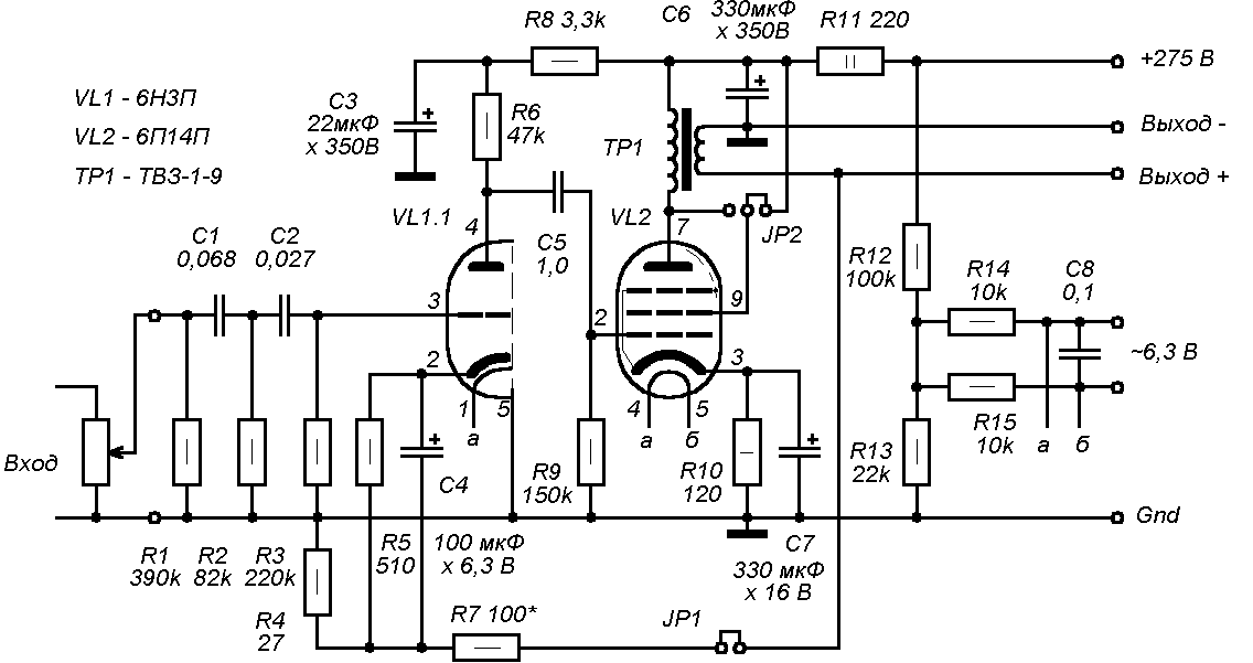 Усилитель двухкаскадный. Первый каскад построен на одной половинке двойного триода 6Н3П (VL1) и представляет собой классический каскад усилителя напряжения. Вторая половинка лампы использована во втором канале усилиеля.
