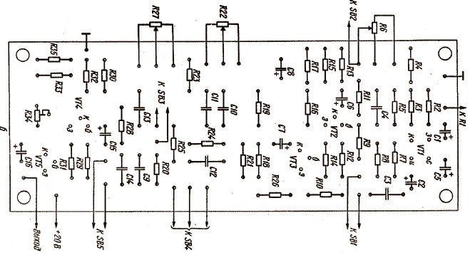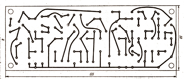 Усилитель собран на печатной плате размерами 135?50 мм (рис.2) из одностороннего фольгированного стеклотекстолита толщиной 1,5 мм. Все постоянные резисторы МЛТ-0,25, переменные-сдвоенные СП3-30Г. Резисторы R6, R22 и R27 должны быть группы В, a R1 - группы А. Подстроечный резистор R34 - СП-5. Конденсаторы - К50-6 и КМ. Кнопочные переключатели П2К.