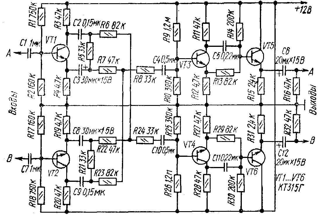 Приставка состоит из двух входных дисперсионных фазовращателей на транзисторах VТ1, VТ2, резисторной матрицы Rб...R8, R22...R24 и двух выходных дисперсионных фазовращателей на транзисторах VТЗ, VТ4. Эмиттерные повторители на транзисторах VТ5, VТ6 выполняют функции буферных каскадов. На входы приставки подаются сигналы левого и правого каналов с ПрУ. С выходов приставки разностные сигналы с соответствующими зависящими от частоты фазовыми сдвигами поступают на УМ тыловых сигналов.