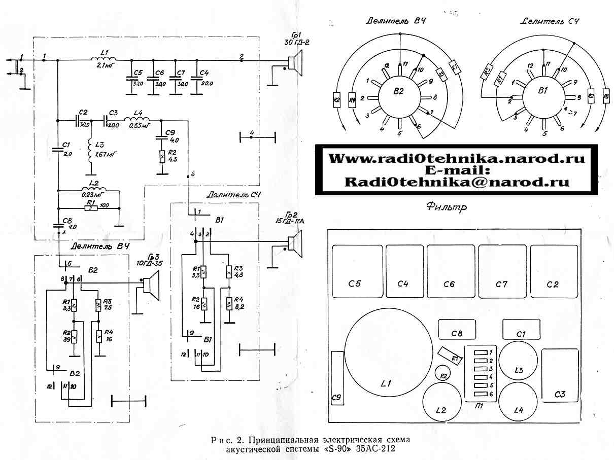 Акустическая система S-90 предназначена для высококачественного воспроизведения звуковых программ в сочетании с различными видами бытовой радиоаппаратуры. В акустической системе имеются два ступенчатых регулятора уровня воспроизведения раздельно для средних и высоких частот в диапазонах от 500 до 5000 Гц и от 5 до 20 кГц соответственно. Оба регулятора имеют по три фиксированных положения: "0","-3дБ" и "-6 дБ". В положении "0" сигнал с разделительного фильтра подается нп соответствующую головку непосредственно. В положениях "-3 дБ" и "-6 дБ" сигнал ослаблен относительно положения "0" на 1.4 и 2 раза соответственно. При соответствующем спектральном составе программы переключением регулятора изменяют тембральную окраску звучания. Положение регулятора выбирается слушателем по его желанию.