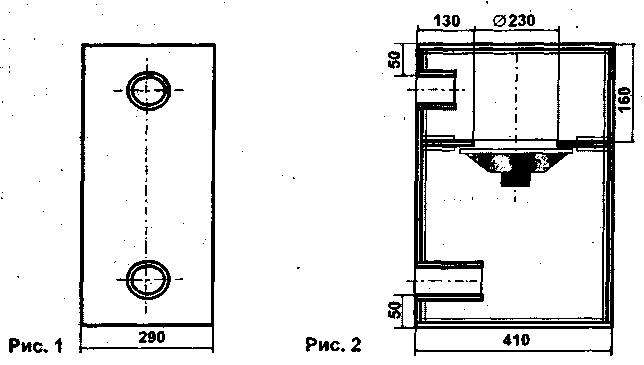 Корпус (рис.1, 2) изготовлен из ДСП толщиной 20 мм. Стенки корпуса соединены друг с другом рейками 20х20 мм с помощью клея и шурупов. Акустическая панель с отверстием под НЧ-головку крепится внутри корпуса АС. Задняя стенка корпуса - съемная, на ней устанавливаются НЧ-фильтр и клеммы (фильтр НЧ - типовой для многополосных АС). Трубы фазоинверторов - с внутренним диаметром 75 мм, длиной 50 и 250 мм, толщина их стенок должна быть не менее 3 мм. Диаметр отверстий для фазоинверторов на чертеже не указан и зависит от диаметра использованных труб. Внутренняя поверхность корпуса АС оклеивается ватином или поролоном. НЧ-головка крепится к панели винтами. Щели между панелью, НЧ-головкой и стенками корпуса герметизируются пластилином и поролоном. Задняя стенка крепится через поролоновую прокладку. Корпус АС оклеивается шпоном или синтетической пленкой. Отверстия фазоинверторов оформляются декоративными накладками в виде колец.