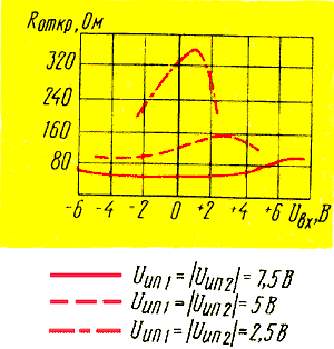 В современной звуковоспроизводящей аппаратуре все чаще используются электронные селекторы сигналов, выполненные на основе аналоговых ключей и коммутаторов МОП структур серий 176, 561, 590. Наряду с такими достоинствами, как высокая надежность, хорошая помехозащищенность, удобство управления, указанные выше устройства имеют один существенный недостаток - сравнительно большие (до 0,2 %) [1] искажения, вызванные нелинейной зависимостью сопротивления открытого канала ключа от амплитуды входного сигнала: Roткp = f(Uвx) - эта зависимость при различных амплитудах коммутируемого сигнала показана на рис.1.