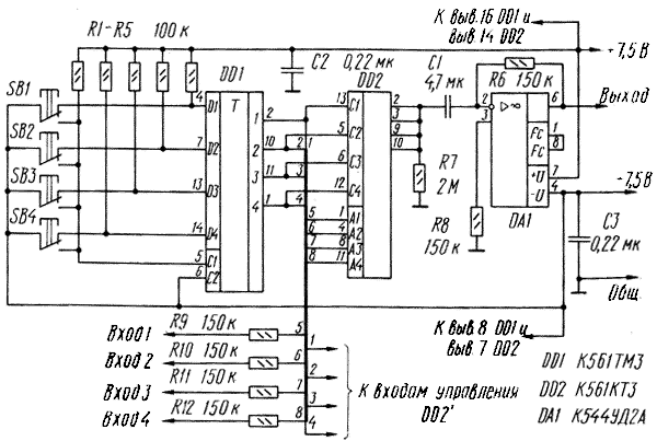 Анализ приведенных на рис.1 кривых показывает, что для достижения малых нелинейных искажений необходимо уменьшать амплитуду коммутируемого сигнала и выбирать напряжение питания ключа значительно выше уровня входного сигнала. С учетом изложенных выше положений автором разработан селектор входов для высококачественного усилителя 3Ч. Отличительная его особенность - подключение выходов электронных ключей к инвертирующему входу ОУ "искусственная земля" [2], что позволило снизить напряжение на них до единиц милливольт. В качестве коммутирующего элемента использован электронный ключ 561КТ3, не создающий коммутационных помех и сопротивление открытого канала которого мало зависит от величины входного напряжения. Основные технические характеристики селектора: число переключаемых входов - 4 максимальная амплитуда коммутируемого сигнала, В - 5 полоса рабочих частот по уровню +0,5 дБ, Гц - 20...100000 коэффициент гармоник в полосе частот 20...20 000 Гц, %, не более - 0,01 Принципиальная схема одного из каналов селектора показана на рис.2.