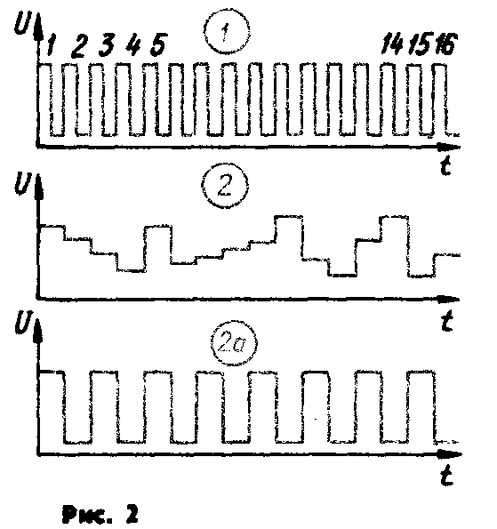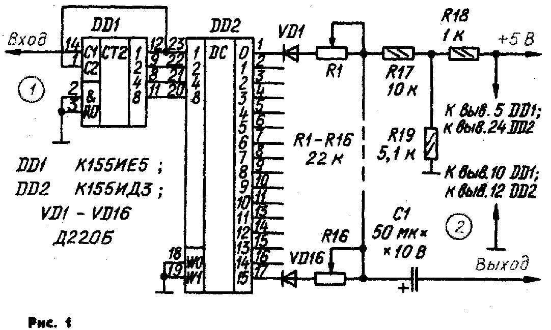 Основу преобразователя составляют счетчик DD1 и дешифратор DD2 (см. схему на рис. 1). За 16 импульсов, поступивших с ЭМИ на вход С1 счетчика DD1 (диаграмма 1 на рис. 2), преобразователь совершает полный цикл работы, формируя один обработанный импульс. Одна из возможных форм импульса показана на рис. 2 (диагр. 2). Форма импульса зависит от сопротивления каждого из резисторов линейки R1 —R16. Если в преобразователе использовать переменные резисторы серии СПЗ-23, установленные на пульте управления в ряд (как в эквалайзере), то по положению ручек резисторов можно наглядно выбирать требуемую форму импульса. Идея такого использования счетчика и дешифратора заимствована из [1]. В отличие от преобразователей, основанных на RC-цепях, на вход рассматриваемого преобразователя можно подавать сигнал любой частоты, и при этом частотные пропорции будут сохраняться. Такое свойство позволяет использовать его во всем музыкальном диапазоне ЭМИ.
