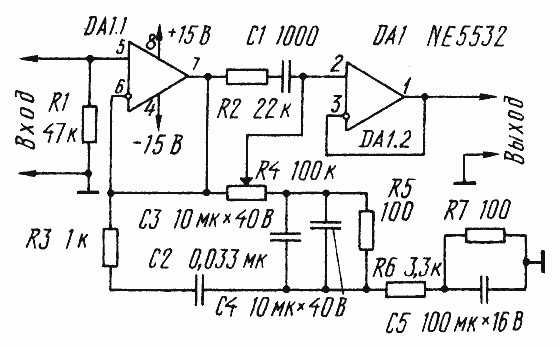 Более удобным выходом из положения является создание тонкомпенсированного регулятора громкости, в котором необходимые уровни коррекций АЧХ в зависимости от громкости воспроизведения определены схемотехническим построением. Схема такого регулятора, хорошо зарекомендовавшего себя в эксплуатации, показана на рисунке. Между двумя операционными усилителями (ОУ), включенными как неинвертирующие повторители, включены элементы компенсации. Регулировка производится переменным резистором R4. Когда его движок находится в крайнем левом по схеме положении, сигнал с выхода ОУ DA1.1 передается на вход ОУ DA1.2 непосредственно. В этом случае коэффициент передачи равен 1 и АЧХ равномерна в пределах от 10 Гц до 100 кГц. При крайнем правом положении движка переменного резистора коэффициент передачи на самых низких частотах определяется последовательно включенными резисторами R4 - R6. По мере увеличения частоты в работу вступают конденсаторы С3 - C5, а затем и цепочка R3 С2. Минимальный коэффициент передачи устройства в области 500...1500 Гц. При работе на частотах свыше 5000 Гц начинает сказываться действие цепи R2 С1 и коэффициент передачи с ростом частоты повышается. Глубина подавления частотных составляющих зависит от положения переменного резистора R4 - максимальна она в крайнем правом положении. В реально работающем устройстве были получены следующие значения (уровень АЧХ на частоте 1500 Гц принят за 0 дБ): 20 Гц - +24 дБ, 100Гц - +17дБ,200Гц - +12дБ, 500Гц - +4 дБ, 5 кГц - +8 дБ, 10 кГц - + 10дБ.